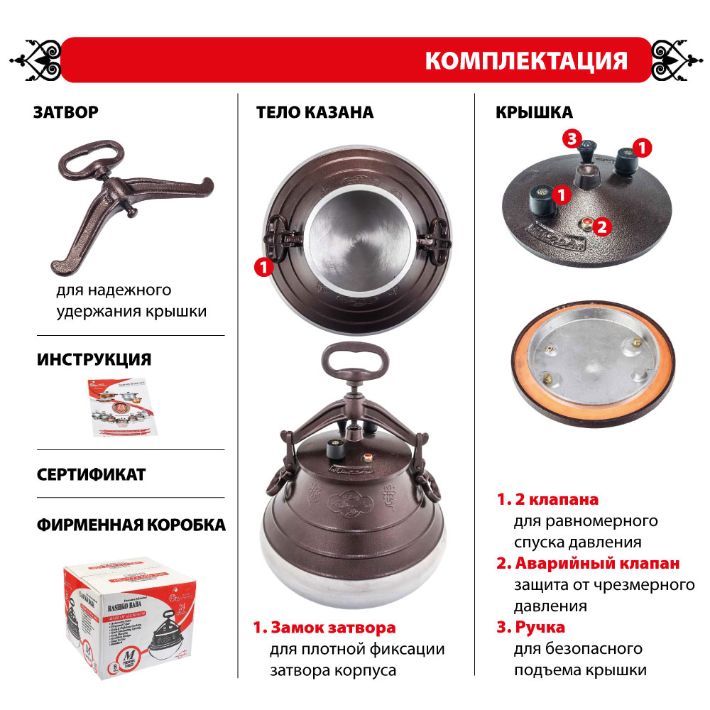 Продукты в афганском казане готовятся под давлением пара при герметично закрытой крышке, плотно прилегающей, благодаря уплотнительной прокладке. Клапаны — три рабочих и один аварийный — не позволяют скапливаться избыточному давлению и обеспечивают безопасное использование казана. Еда готовится быстро и сохраняет все полезные свойства. В афганском казане можно готовить очень многое: каши, супы, жаркое, тушеные мясо и овощи, как на обычной плите, так и на огне или на углях. Идеально для трапезы на свежем воздухе! В магазине Plover афганские казаны разделены на четыре группы: черные, никелированные, комби-никель и двухцветные, также в наличии силиконовые прокладки и клапаны.