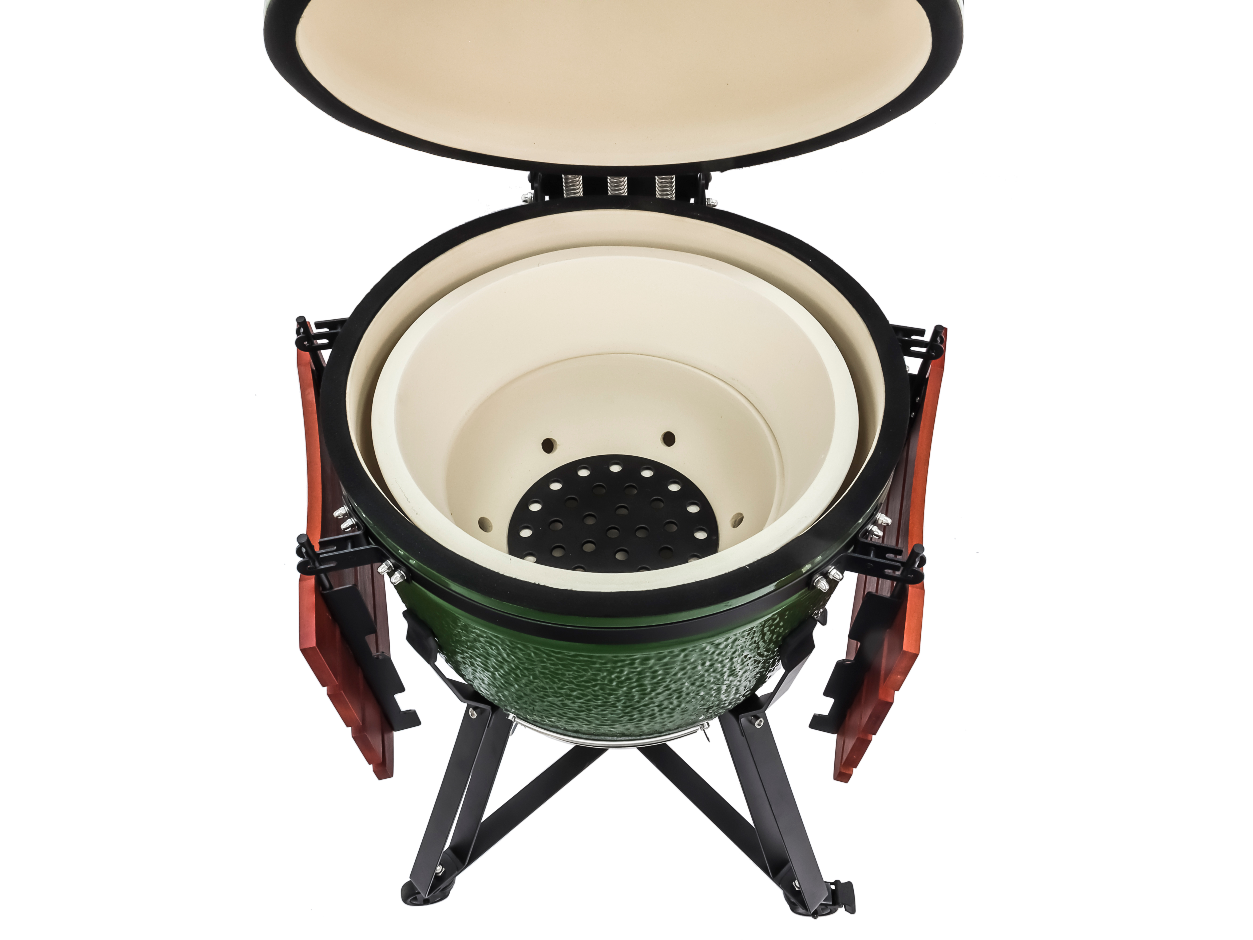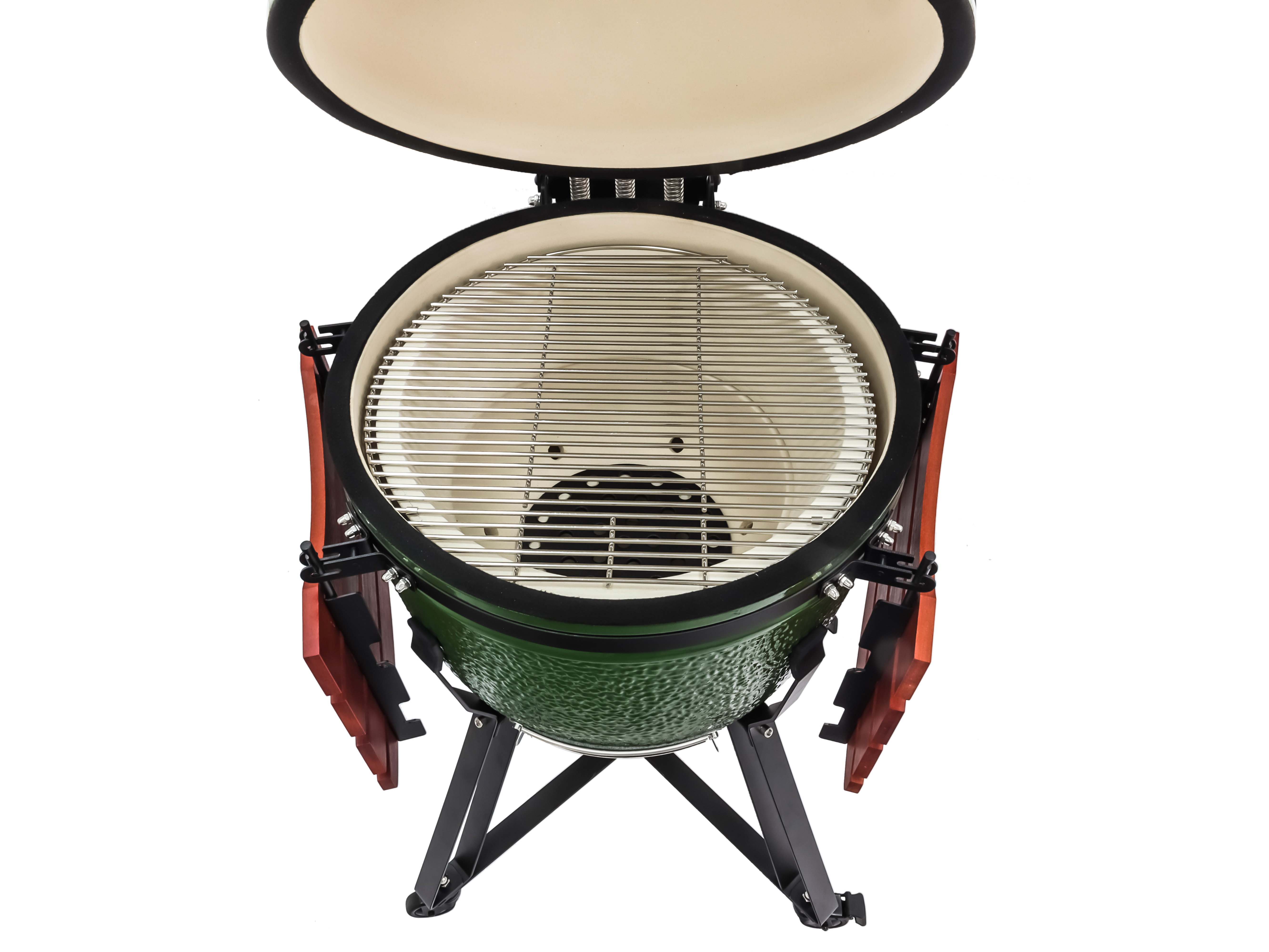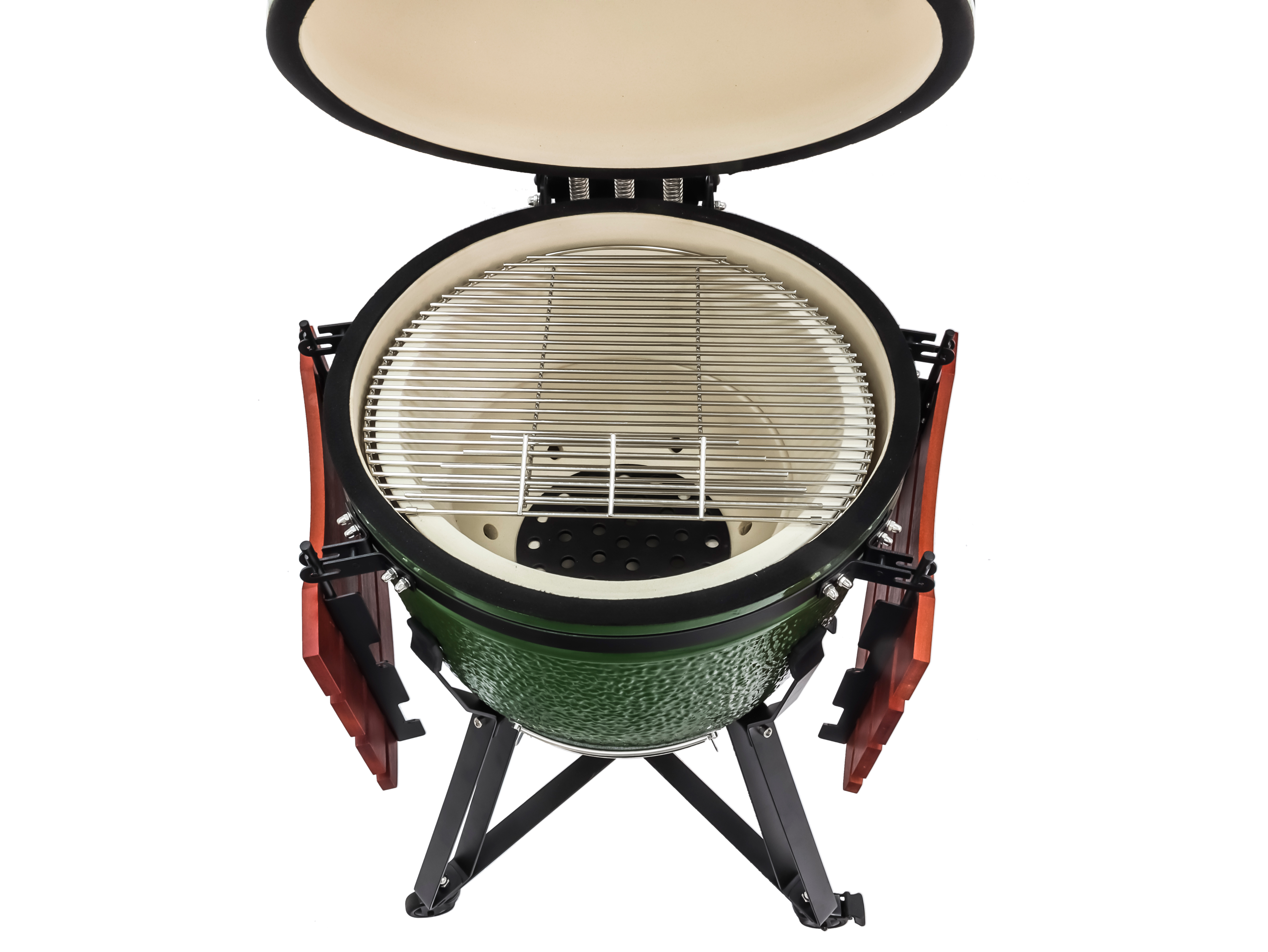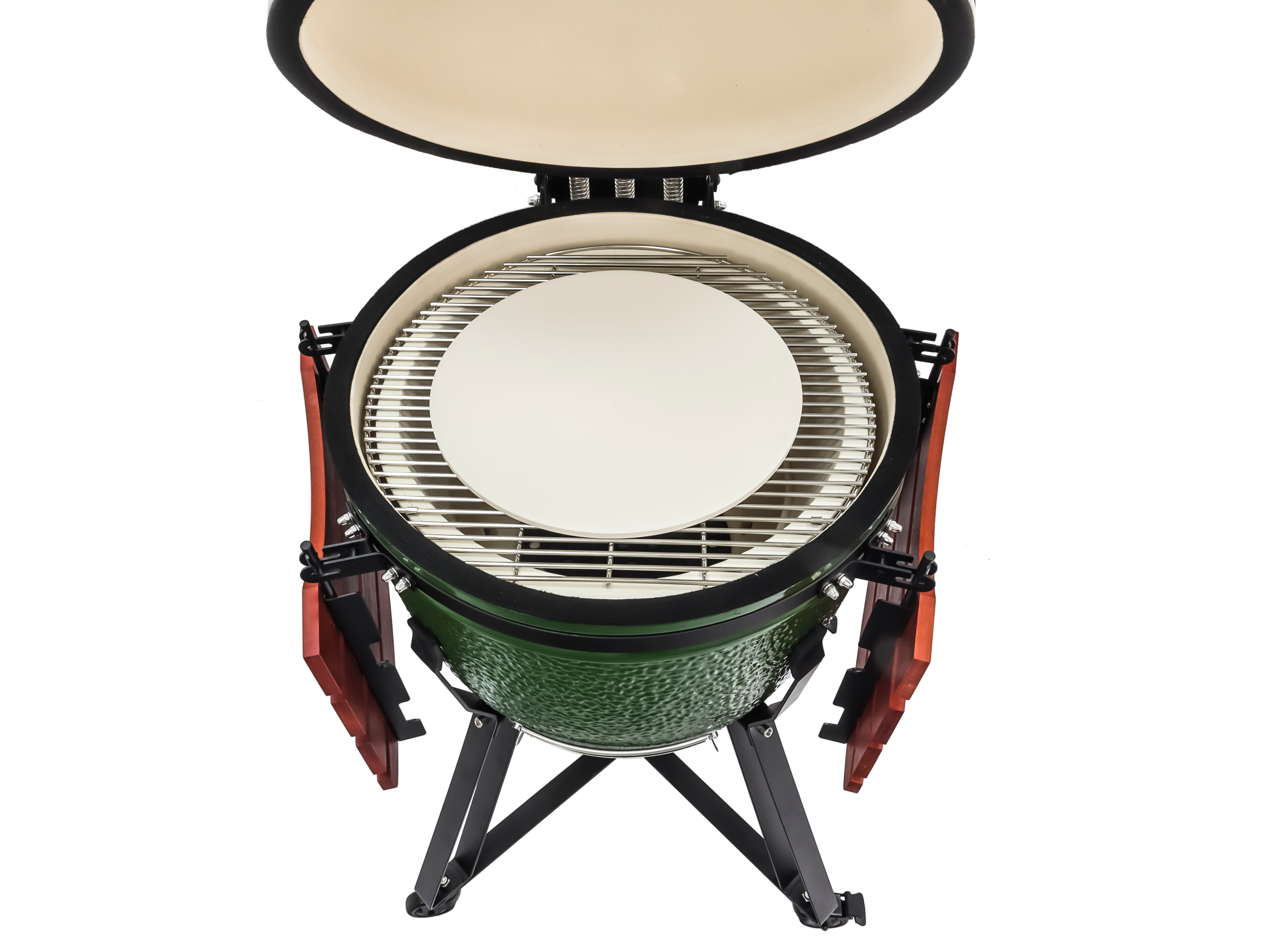 Комплектация: складные бамбуковые столики, подставка из стали на колесах, регулятор тяги; термометр; решетка-гриль из нержавеющей стали; камень для выпечки; колосник; фирменный фартук.