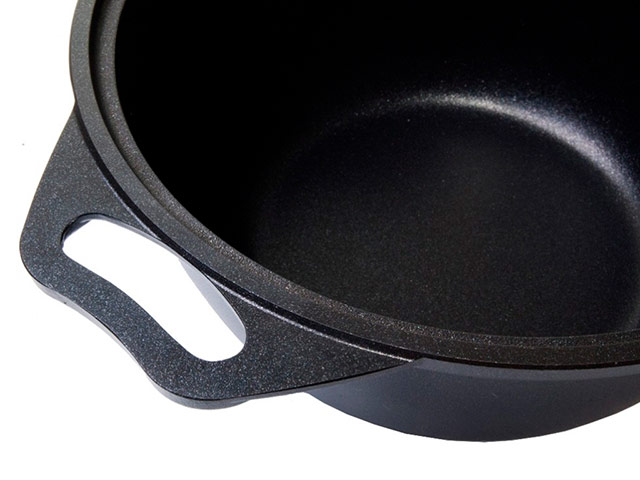 Посуду серии “Традиция” отличают классический черный цвет и стойкое трехслойное антипригарное покрытие со сверхпрочными минеральными частицами. Чтобы напыление лучше держалось, между ним и металлическим корпусом кастрюли нанесён слой с шероховатой поверхностью для лучшего сцепления. Проведенные в лаборатории предприятия испытания показали, что кастрюля “Традиция” выдерживает 12000 условных циклов истирания — полных циклов приготовления пищи, включая мытье посуды. То есть, ежедневно готовить в кастрюле Kukmara можно более тридцати лет, и всё это время она будет сохранять свои свойства.