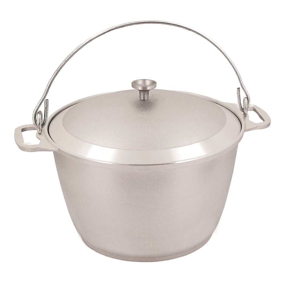 Технология литья позволяет создавать из алюминия прочные, толстостенные, не подверженные деформации походные котлы. При одинаковом объеме и толщине стенок они весят меньше чугунных аналогов, котел Kukmara из литого алюминия проще взять с собой в поход или на дачу. Пищевой сплав, из которого изготовлен котел, соответствует ГОСТам и проходит на производстве неоднократный контроль качества и безопасности. В комплект входит крышка. Прочная дужка позволяет подвесить котел над костром. Треногу или подставку для походного котла вы также найдете в каталоге магазина.