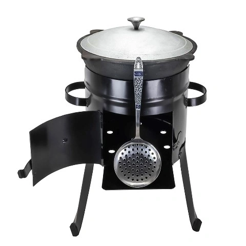 Все элементы набора идеально подобраны по размеру, это очень важно: параметры казана, инвентаря и печи, на которой вы готовите, должны соответствовать друг другу. Казан в печи будет прочно стоять и равномерно прогреваться со всех сторон, а шумовкой будет удобно пользоваться. Благодаря небольшому весу, печь легко переносить на дачном участке и брать с собой на природу.