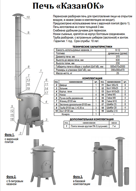 Удобная и надежная печь для приготовления пищи на открытом воздухе в казане емкостью 8-12 литров. Предусмотрено использование печи с варочной плитой. Корпус печи сварной, изготовлен из листовой стали толщиной 3 мм. Имеются удобные ручки для переноски, топочная дверца и зольный ящик. Ножки крепятся на корпус болтовым соединением.