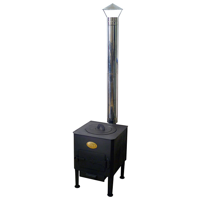 Печь предназначена для обогрева помещений и приготовления блюд в казане, кастрюле, на сковороде - благодаря сменным конфоркам. Высокий дымоход из нержавеющей стали. Обработана высокотемпературной краской. Цвет печи - черный.