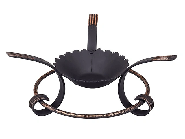 Кованая подставка позволяет красиво подать садж с мясом и овощным гарниром. В емкость помещается нагревающий компонент, поддерживающий температуру сковороды и ее содержимого — угли, свеча, спиртовая горелка, мармитное топливо. Температуру нагрева можно регулировать: пламя свечи поддерживает теплый режим, горелка или угли — горячий. Обратите внимание, что размер подставки зависит от размера сковороды.
