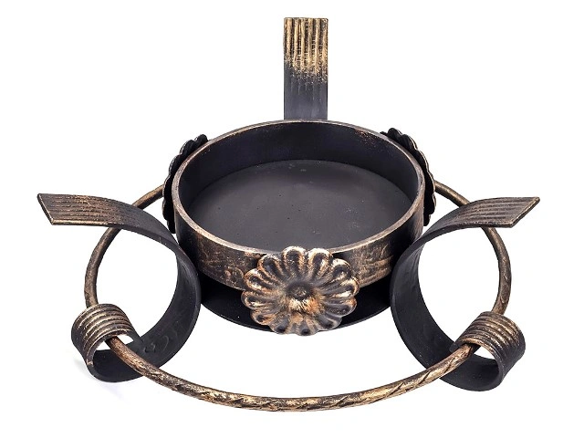 Кованая подставка позволяет красиво подать на стол садж с мясом и овощным гарниром. В емкость помещается нагревающий компонент, поддерживающий температуру сковороды и ее содержимого — угли, свеча, спиртовая горелка, мармитное топливо. Температуру нагрева можно регулировать: пламя свечи поддерживает теплый режим, горелка или угли — горячий. Обратите внимание, что размер подставки зависит от размера сковороды садж. Эта подставка идеально подходит для саджа диаметром 30-40 см, а также для казана объемом 8-12 литров.