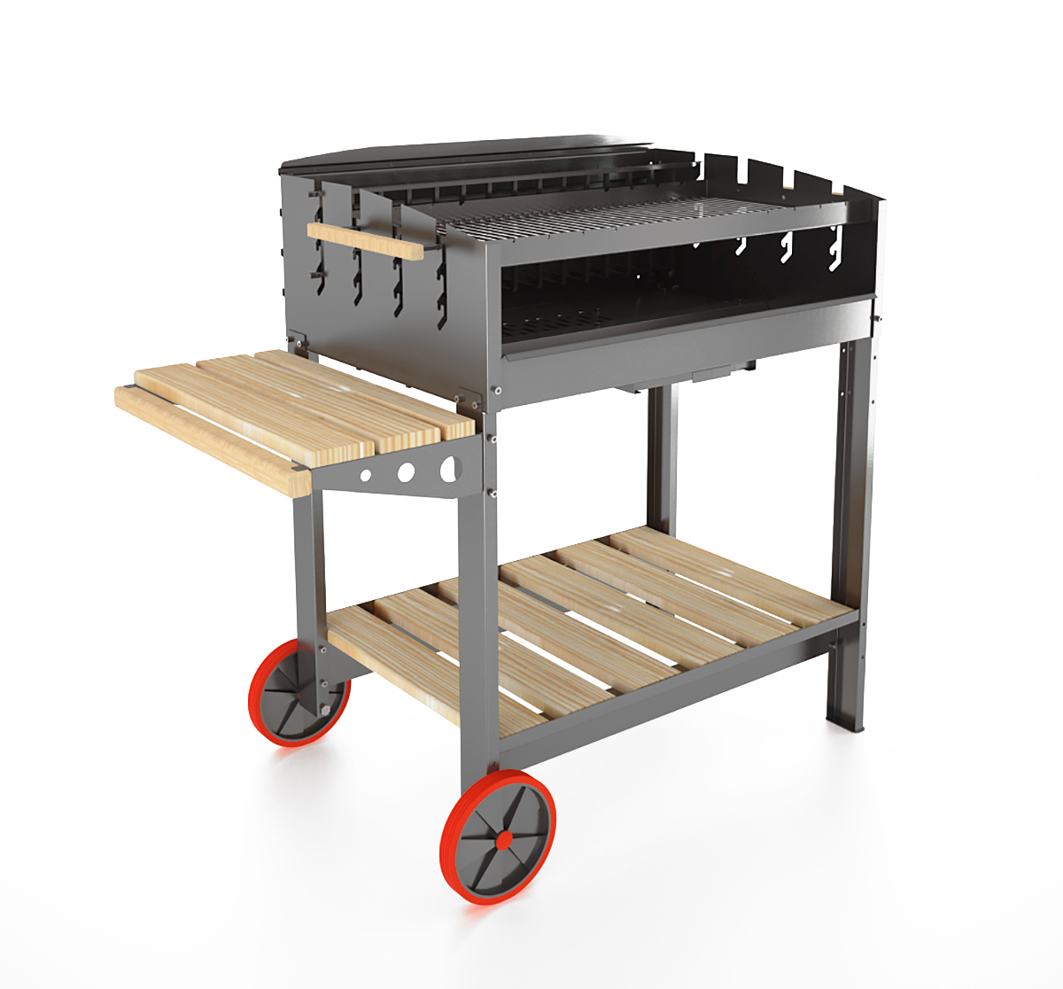 Изделие, представленное в каталоге нашего сайта, оборудовано небольшими колесами, жаровней, имеющей четыре позиции для регулировки высоты решетки, а также зольником для сбора пепла. Все это, в сочетании с компактными размерами, делает устройство практичным и незаменимым на даче для каждого ценителя хороших вещей. Дополнительно можно приобрести крышу.