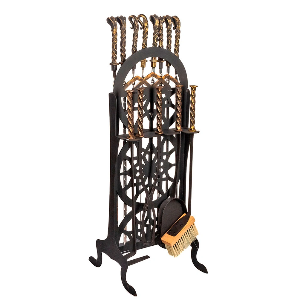 Красивая стойка с комплектом приборов украсит ваше каминное пространство или мангальную зону.