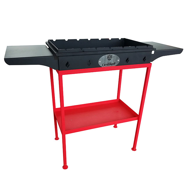Предназначен для приготовления пищи на углях и дровах. Прочен, надёжен, долговечен, прост в эксплуатации. Мангал стальной с двумя боковыми столиками и нижней полкой. Окрашен термостойкой эмалью. Цвет: корпуса, столиков - чёрный, основание - красный.