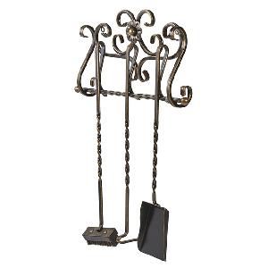 Изящный каминный набор крепится непосредственно к стене, благодаря чему занимает минимум свободного места и может использоваться даже в небольшом тесном помещении. Он состоит из элегантной подвесной полки, декорированной крупным металлическим цветком, а также трёх инструментов для ухода за камином.
