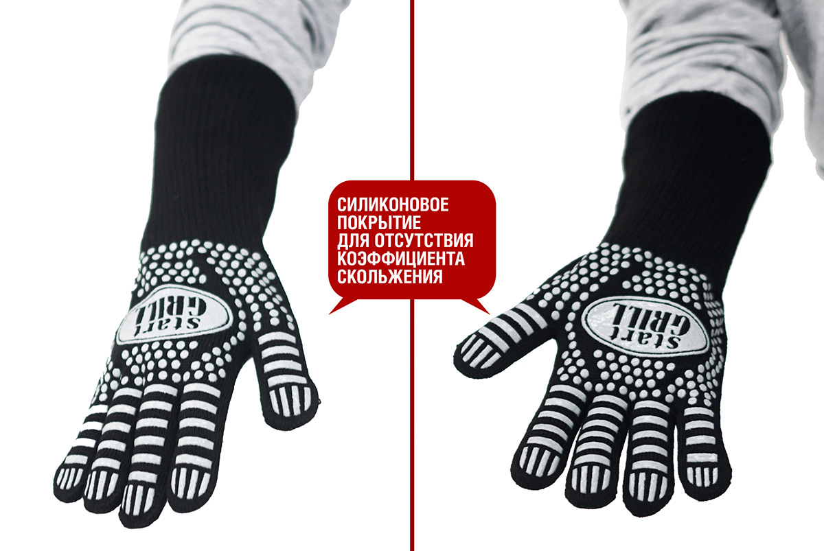 Перчатка имеет универсальный размер: длина 35 см, ширина в 17 см, а удлиненная манжета обеспечит максимальную защиту запястий. Прочная и огнеупорная арамидная ткань снаружи в сочетании с хлопковой тканью внутри позволит без опасений, безопасно прикасаться к разогретым частям гриля и решеткам во время готовки: до 10 секунд при температуре 800 С° и до 60 секунд при температуре 100 С°. Благодаря специальному не скользящему силиконовому покрытию перчатки не портятся и не деформируются при контакте с горячими предметами. В комплекте 2 перчатки.
