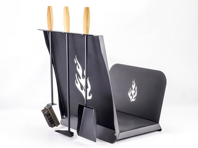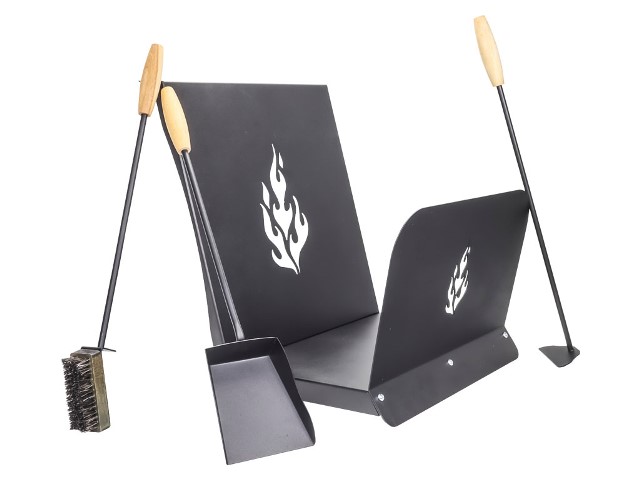 Состоит из четырёх предметов: дровницы, щётки для очистки очага, совка и кочерги.