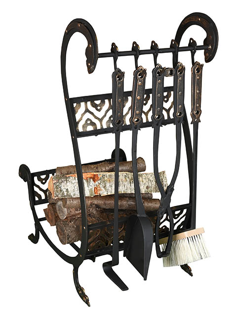 Элегантная каминная стойка совмещает в себе функции дровницы и аксессуар для хранения каминного набора: совка, клещей, метелки, кочерги. Кованая стойка послужит прекрасным украшением интерьера возле камина.