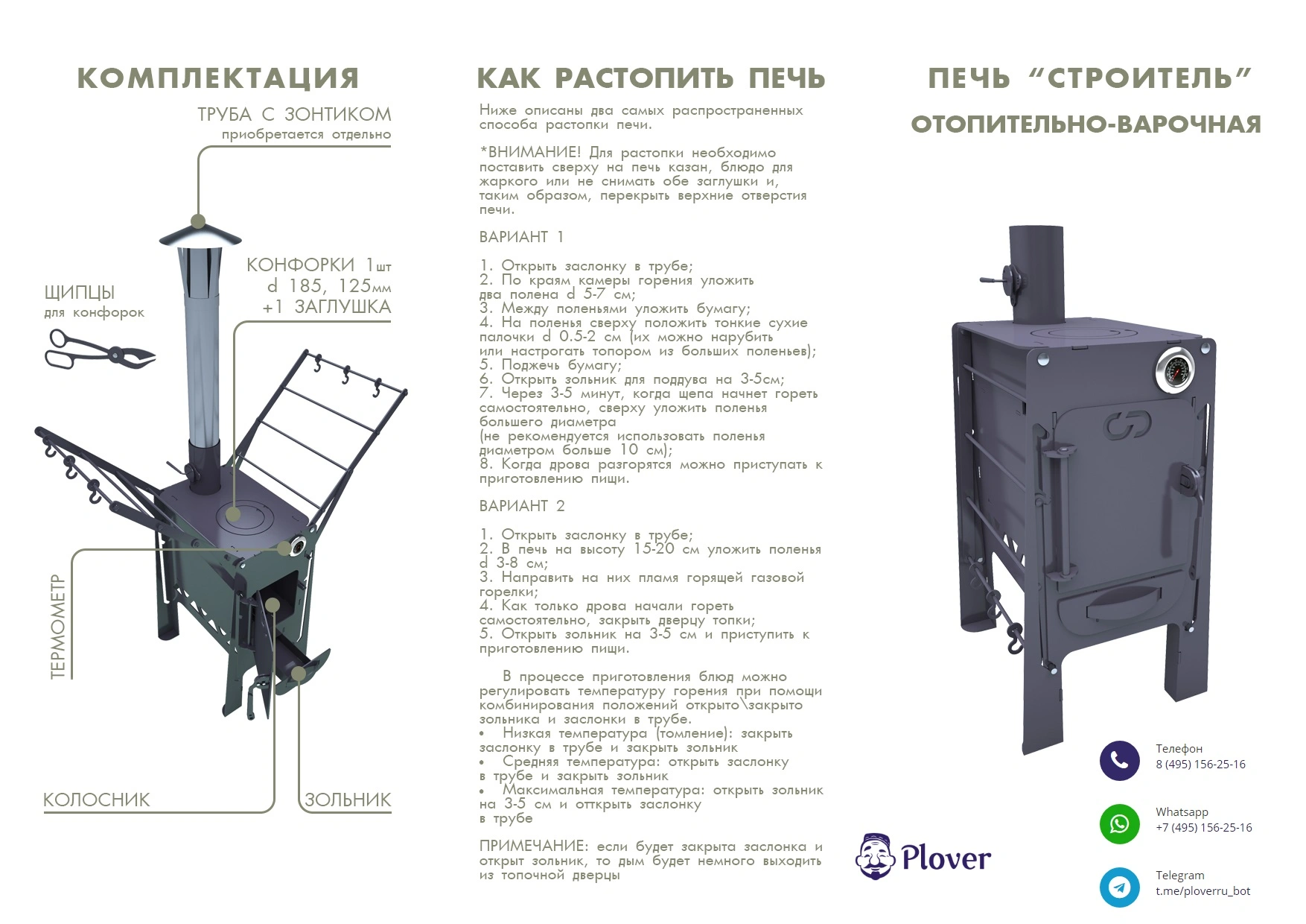 Как отопить строительное помещение, в котором просто неоткуда взяться центральному отоплению? Или перед вами стоит задача быстро прогреть дачный домик, гараж, хозяйственное помещение? Компактная отопительно-варочная печь прекрасно справляется со своими функциями. С ее помощью вы не только сможете эффективно отапливать небольшое помещение 50-80 кв м, но и приготовить пищу. Такая печь в отличие от каменной занимает намного меньше места, экономя пространство. Печь оснащена системой двойного дожига, что не только увеличивает КПД, но и сокращает количество вредных веществ и токсичных газов, выбрасываемых в атмосферу. А шиберная заслонка позволяет контролировать температуру. Преимущество данной модели в откидных полочках, на которых можно просушить одежду и обувь. Благодаря наличию варочной поверхности, печь решает сразу две задачи - поддержание тепла в помещении и приготовление пищи.