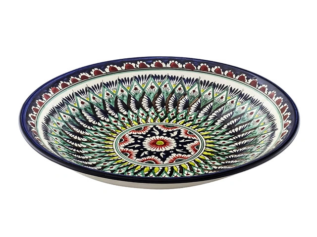 Ляган — узбекская тарелка для плова или другого главного блюда. Раньше ляганы ручной работы с уникальной росписью подавали на стол только по праздникам, но теперь эта красивейшая посуда доступна нам каждый день. Глазурованные ляганы из Риштана, исторического центра керамического промысла, ценятся особо. Их тонкие, радующие глаз орнаменты нарисованы натуральными красителями, которые веками использовались в Узбекистане. Риштанская керамика превратит обычный домашний обед в яркое восточное застолье. Внимание: посуда из красной глины не предназначена для использования в микроволновой печи и посудомоечной машине. Так как изделия изготовлены и раскрашены вручную, орнаменты и цвета могут иметь отличия от образцов на снимках — каждый экземпляр уникален.