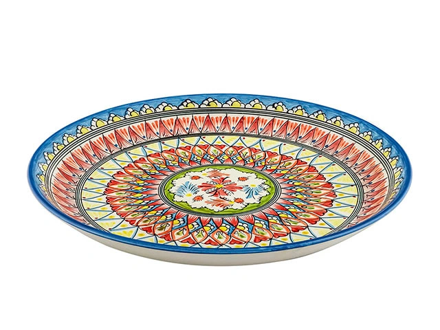 Ляган — узбекская тарелка для плова или другого главного блюда. Раньше ляганы ручной работы с уникальной росписью подавали на стол только по праздникам, но теперь эта красивейшая посуда доступна нам каждый день. Глазурованные ляганы из Риштана, исторического центра керамического промысла, ценятся особо. Их тонкие, радующие глаз орнаменты нарисованы натуральными красителями, которые веками использовались в Узбекистане. Риштанская керамика превратит обычный домашний обед в яркое восточное застолье. Внимание: посуда из красной глины не предназначена для использования в микроволновой печи и посудомоечной машине. Так как изделия изготовлены и раскрашены вручную, орнаменты и цвета могут иметь отличия от образцов на снимках — каждый экземпляр уникален.