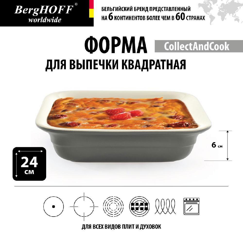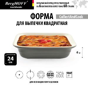 Керамическая форма бренда BergHOFF, Бельгия. Артикул товара 4490275. Длина и ширина формы 24 см, высота 6 см, вес 1,65 кг. У нас вы можете заказать или купить в Москве форму для выпечки квадратную BergHOFF, 24 см (серую), и другую продукцию бельгийской марки.