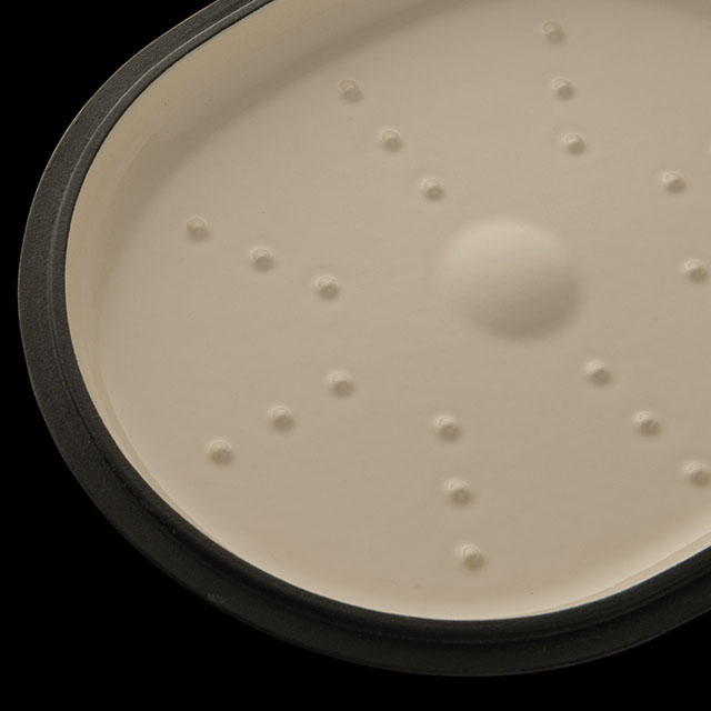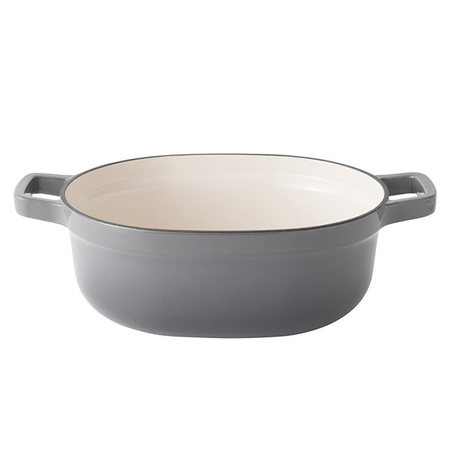 Посуда внутри покрыта эмалью кремового цвета, снаружи — глянцевая эмаль серого цвета. Толстые стенки отлично аккумулируют и долго сохраняют тепло. Чугунная крышка удерживает влагу внутри, и благодаря капельному рельефу испаряющиеся соки скатываются обратно в пищу, обеспечивая блюду особенную сочность и мягкость. Удобные ручки позволяют легко перемещать посуду на кухне.