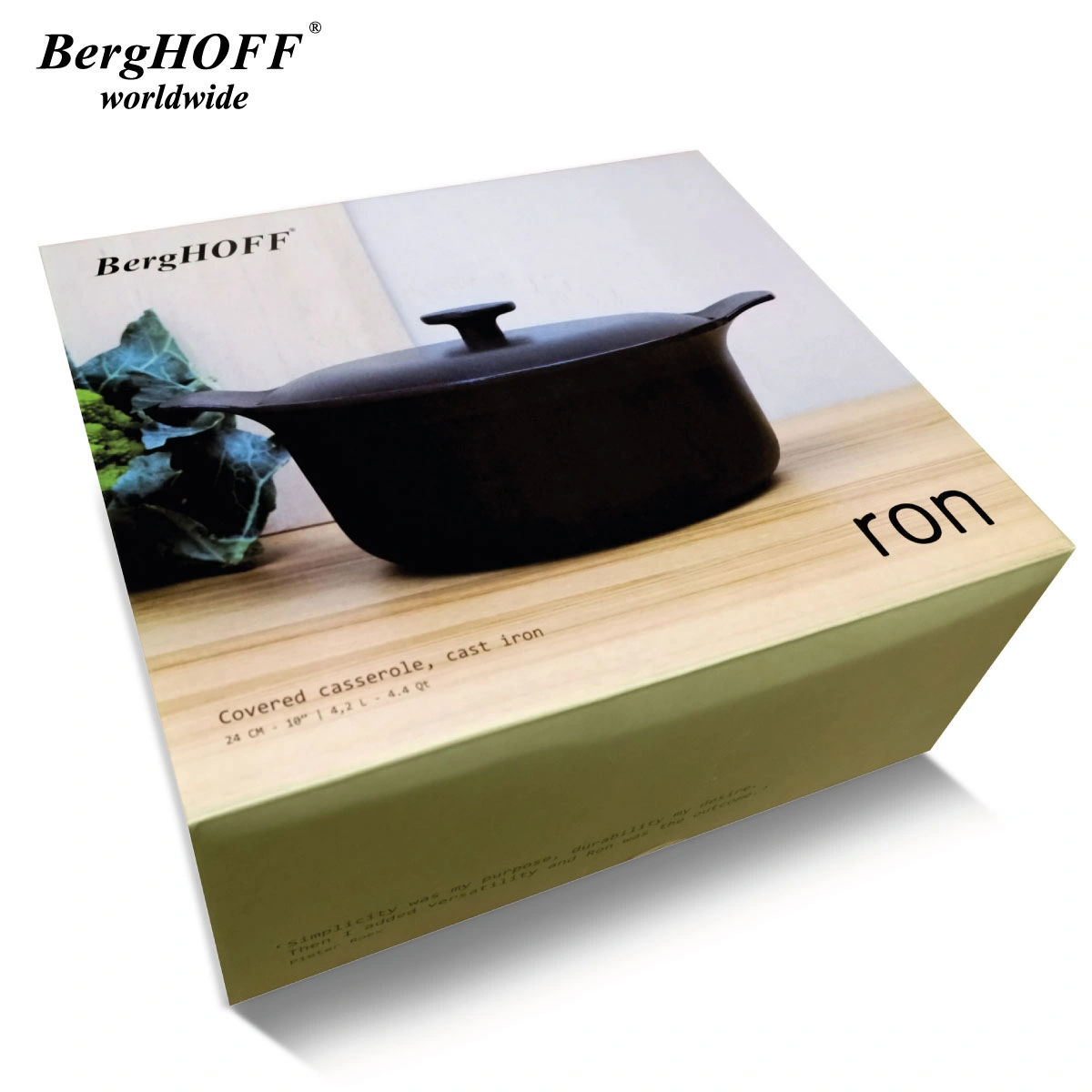 Ron — одна из линий кухонного инвентаря известной марки BergHOFF. Посуду этой серии легко узнать по ее необычному и современному внешнему виду, использованию контрастных материалов и цветов. Кастрюля идеальна для тушения и томления блюд в духовке или на плите: чугун прекрасно аккумулирует тепло, а благодаря “капельному” рельефу крышки испаряющиеся соки скатываются обратно, обеспечивая блюду сочность и мягкость. Удобные широкие ручки позволяют перемещать кастрюлю даже в толстых кухонных рукавицах.