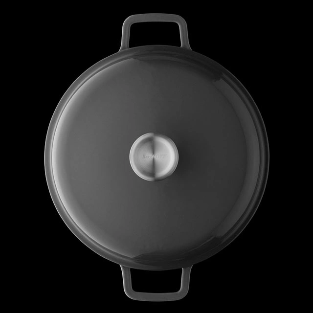 Посуда внутри покрыта эмалью кремового цвета, снаружи — глянцевая эмаль серого цвета. Толстые стенки отлично аккумулируют и долго сохраняют тепло. Чугунная крышка удерживает влагу внутри, и благодаря капельному рельефу испаряющиеся соки скатываются обратно в пищу, обеспечивая блюду особенную сочность и мягкость. Удобные ручки позволяют легко перемещать посуду на кухне.