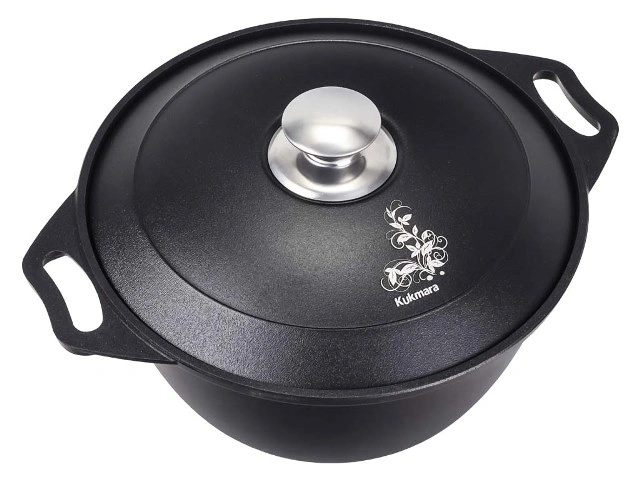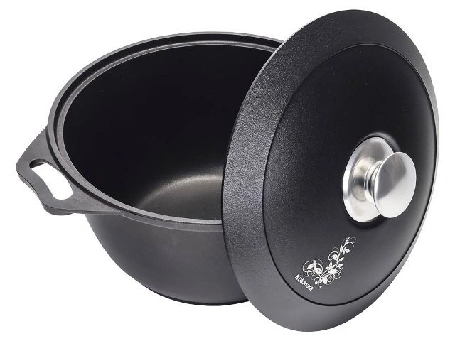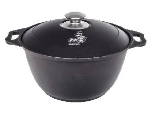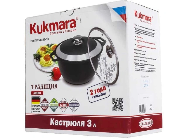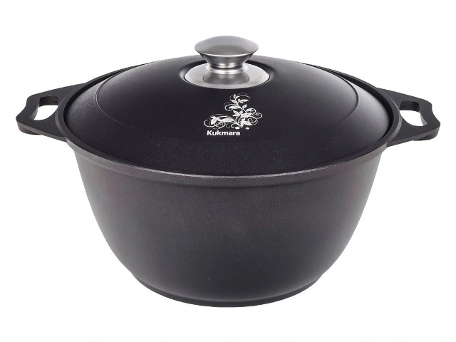Кастрюля "Kukmara" изготовлена из литого алюминия и покрыта немецким высококачественным антипригарным покрытием на водной основе GREBLON® Non-Stick C2+, усиленным сверхпрочными минеральными частицами.
