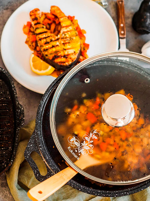 Семейная антипригарная кастрюля российской марки Kukmara. Артикул в магазине кмт32а. Верхний и нижний диаметры кастрюли составляют соответственно 24 и 16 см, высота 12 см, вес 1,76 кг. Имеется крышка с вентиляцией. Купить в Москве кастрюлю с антипригарным покрытием со стеклянной крышкой Kukmara (темный мрамор) кмт32а, 3 л, на сайте магазина вы можете по наилучшей цене.