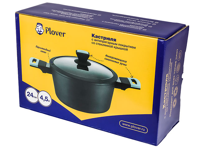 Кастрюля из кованого алюминия марки Plover, страна производства Китай. Артикул в магазине PL079. Диаметр 24 см, диаметр дна 20,5 см, высота 12 см, вес 1,7 кг, объем 4,5 л. Купить в Москве кастрюлю с антипригарным покрытием со стеклянной крышкой PLOVER, 24 см, вы можете самостоятельно или через наших операторов.