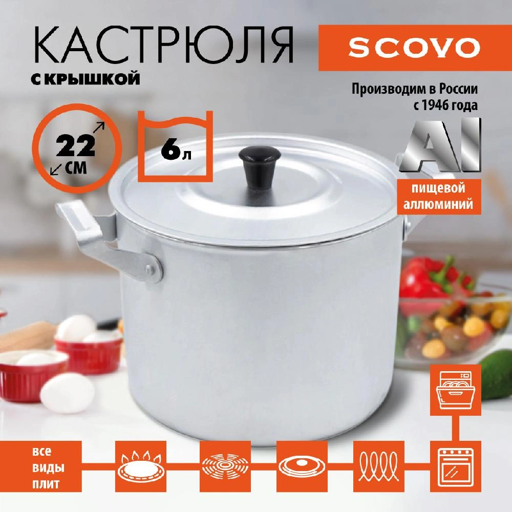 Кастрюля из пищевого алюминия быстро и равномерно нагревается, перепады температуры не представляют для нее опасности. Посуда обработана методом матовой полировки, такая поверхность лучше переносит контакт с металлическими кухонными аксессуарами и мочалками, абразивными моющими средствами — мелкие царапины на ней незаметны. Кастрюлю можно мыть в посудомоечной машине. Российская марка SCOVO ведет свою историю с 1947 года. В разные годы она одной из первых в стране внедряла самые передовые технологии. Продукция уральского предприятия отличается стабильно высоким качеством.