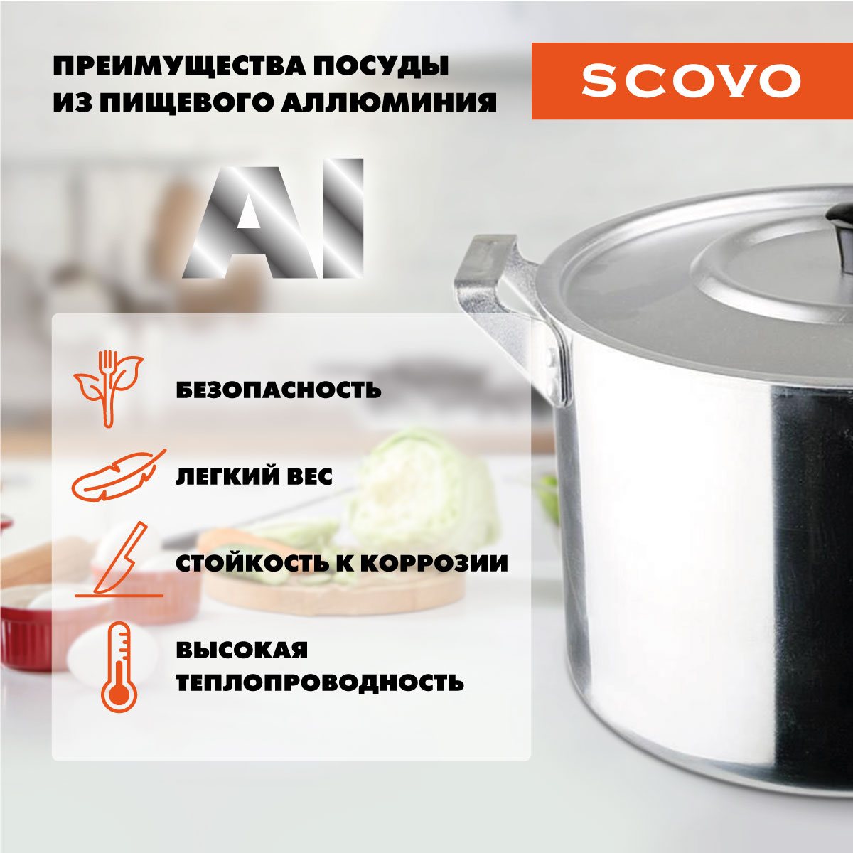 Посуда из пищевого алюминия быстро и равномерно нагревается, перепады температуры не представляют для нее опасности. Посуда обработана методом полировки. Никакого особого ухода за ней не требуется. Кастрюлю можно мыть в посудомоечной машине. Российская марка SCOVO ведет свою историю с 1947 года. В разные годы она одной из первых в стране внедряла самые передовые технологии. Продукция уральского предприятия отличается стабильно высоким качеством.