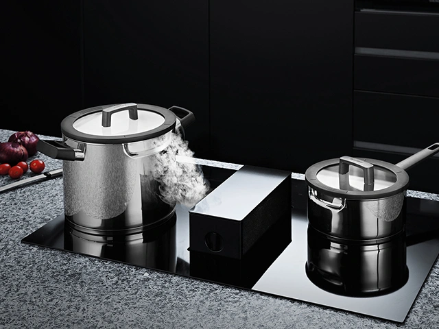 Хотя эти кастрюли подходят для всех типов плит, но в первую очередь они идеальны для варочных панелей со встроенной в их поверхность вытяжкой, такие варочные становятся сегодня всё более и более популярными. Благодаря продуманным запатентованным технологиям пар из кастрюли направляется прямиком к вытяжному каналу.