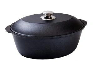 Жаровня для крупной птицы должна держать тепло, поэтому ее стенки и дно имеют дополнительную толщину. Такую посуду делают:
