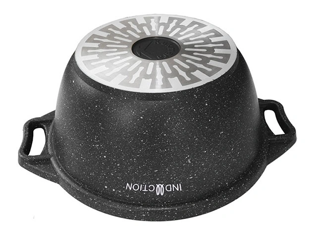 Универсальная, долговечная посуда, пригодная для приготовления практически любого блюда. Через стеклянную крышку удобно наблюдать за процессом. На кастрюле нет пластиковых деталей, ее можно использовать в духовке. Толстое индукционное дно позволяет готовить на всех типах плит. Надежное антипригарное покрытие, произведенное в Германии, не теряет своих свойств, даже если на поверхности кастрюли появляются небольшие царапины.