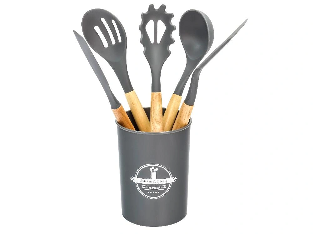 Набор кухонных принадлежностей от бренда Plover из силикона состоит из 6 предметов: лопатка, лопатка кондитерская, половник, шумовка, ложка для спагетти, подставка для принадлежностей.