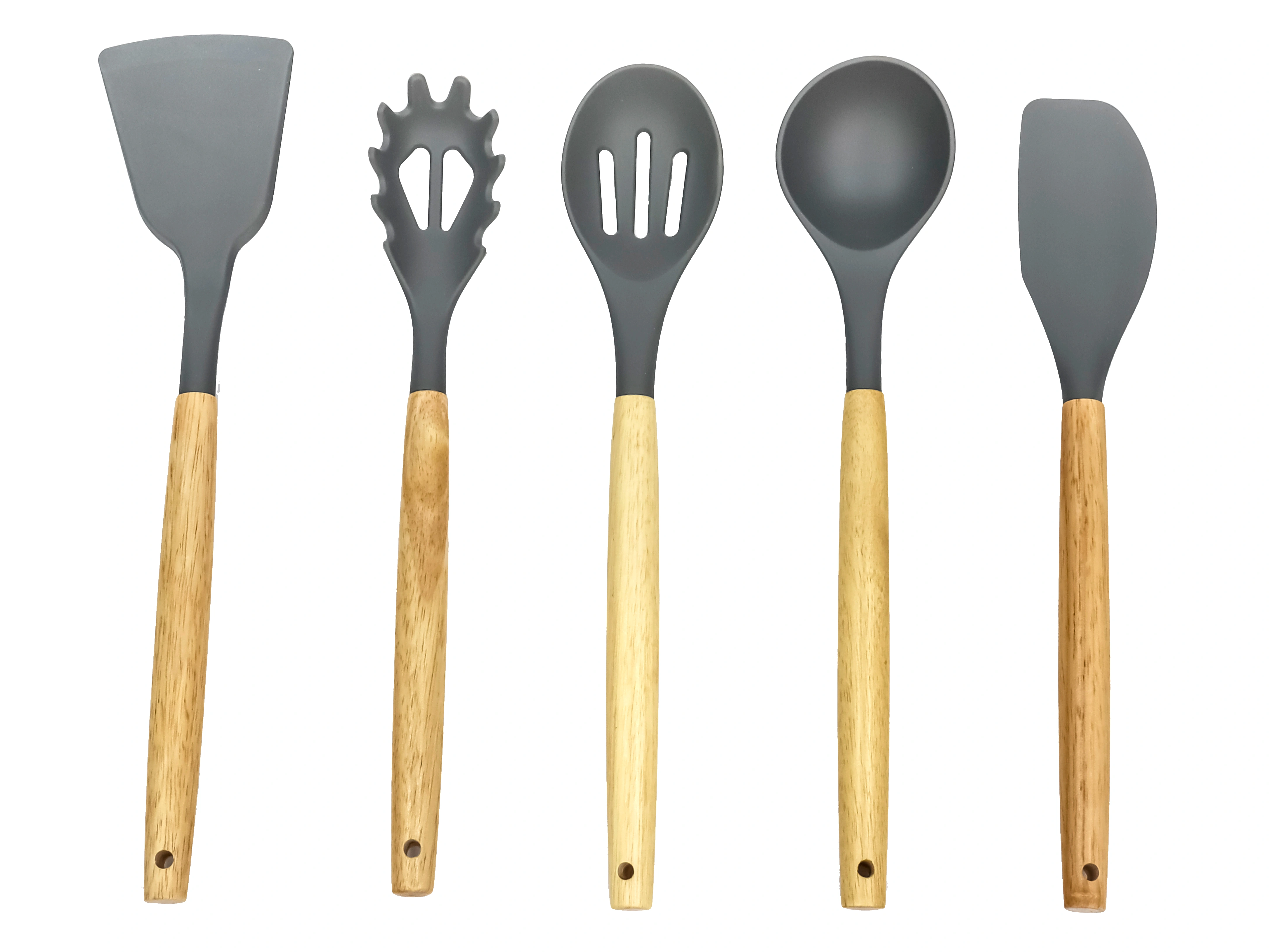 Стильный и удобный набор кухонных принадлежностей станет вашим незаменимым помощником. Прекрасно подойдет в качестве подарка для любителей готовить. Кухонные принадлежности изготовлены из высококачественных материалов: силикона и натурального дерева, что делает их безопасными для здоровья и практичными для использования.