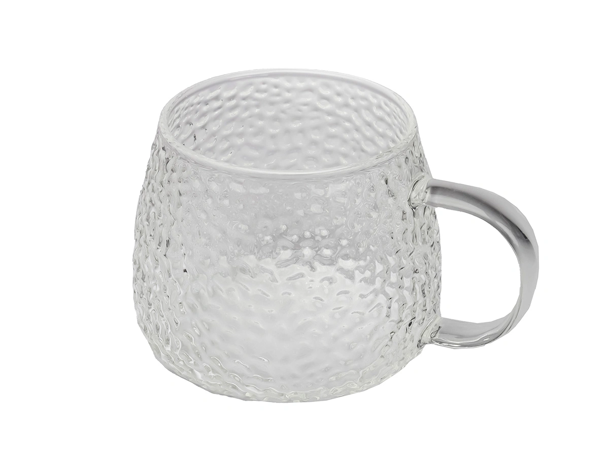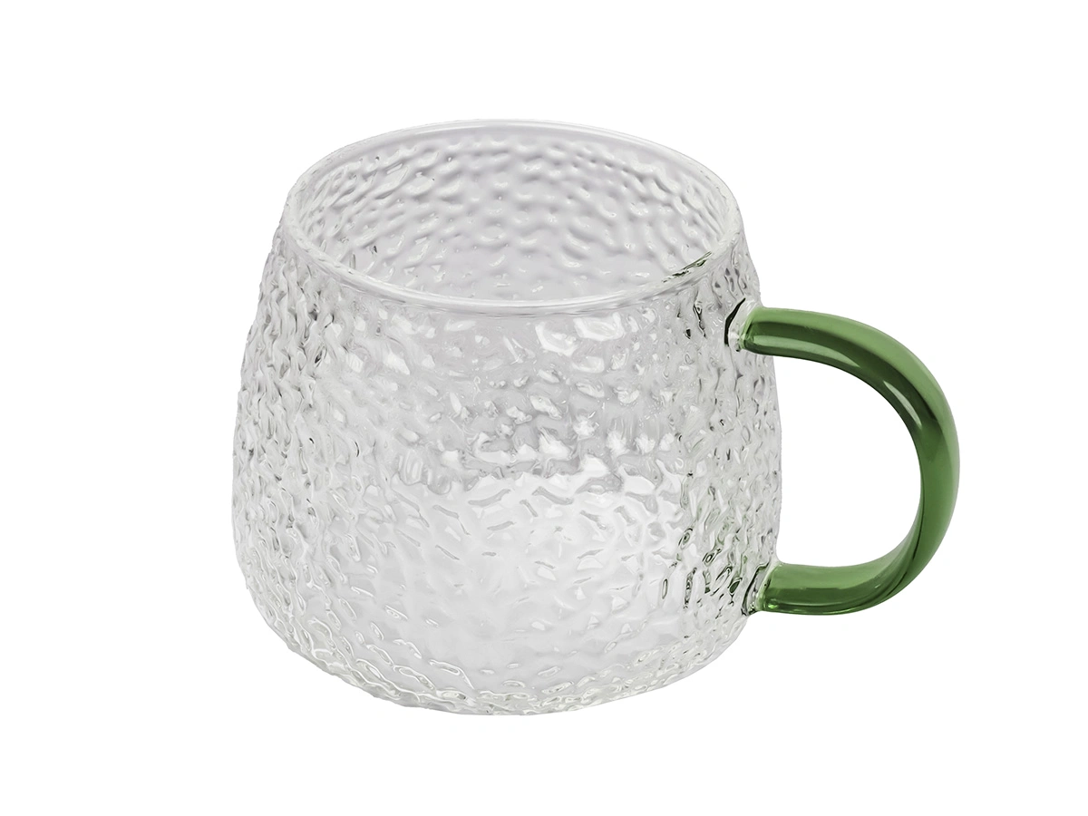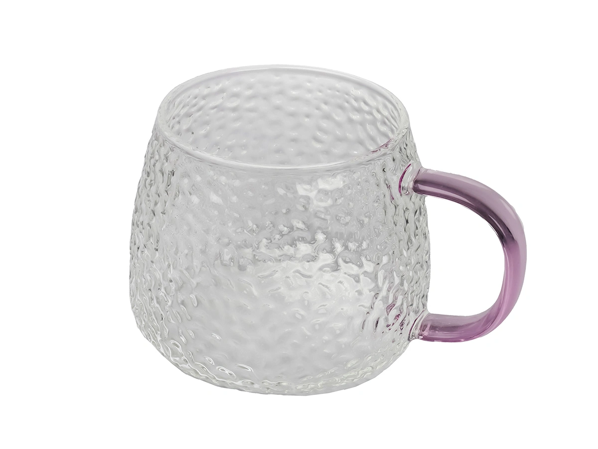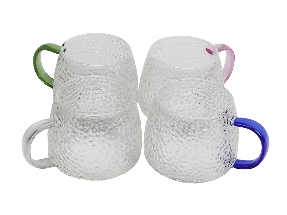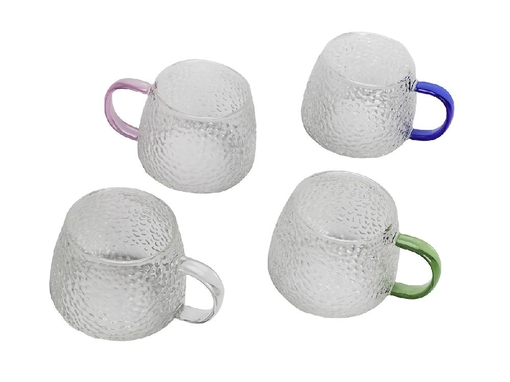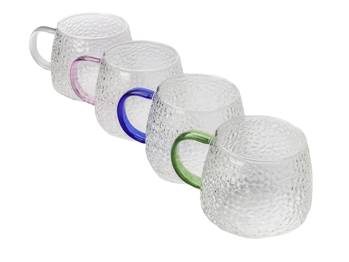 Кружки выполнены из боросиликатного стекла, имеют необычный дизайн с ребристой текстурой и разноцветными ручками. Они идеально подходят для подачи воды, сока, чая или других напитков.
