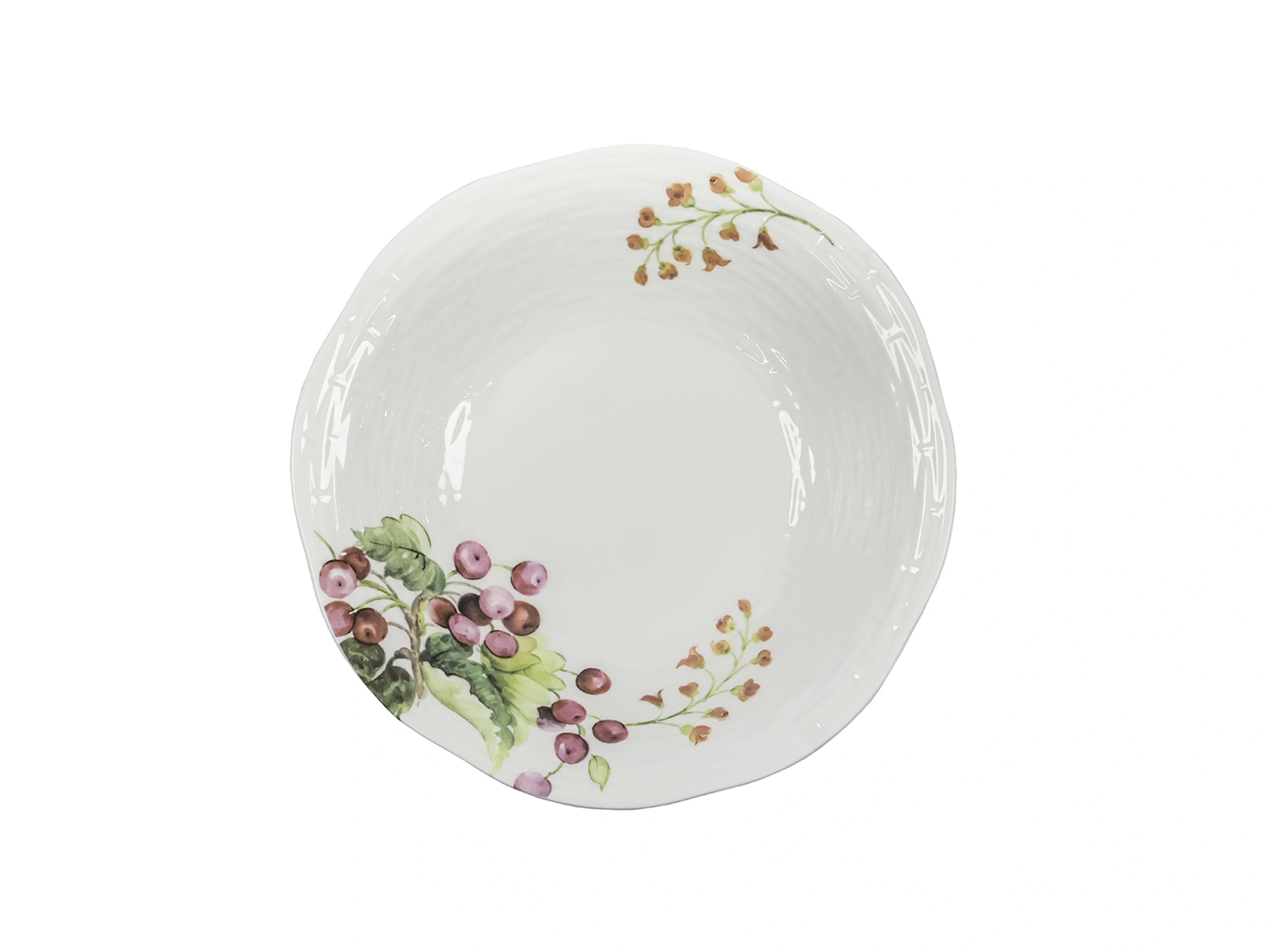 Белый цвет будет эффектно смотреться на Вашем столе, а утонченный рисунок спелых ягод придаст особой изюминки столу и создаст особую атмосферу. Эта элегантная тарелка станет прекрасным дополнением к вашему интерьеру и подчеркнёт вкус хозяйки.