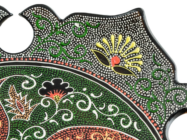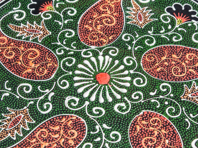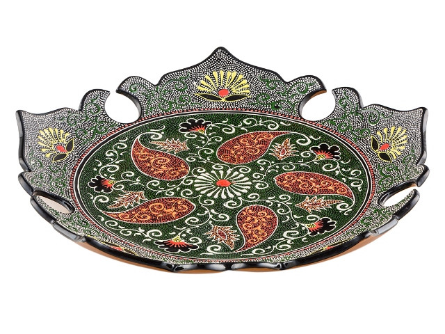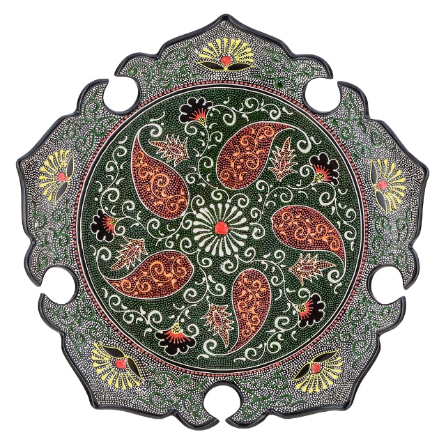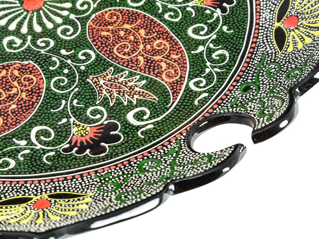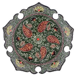 Ляган — узбекская тарелка для плова или другого главного блюда. Раньше ляганы ручной работы с уникальной росписью подавали на стол только по праздникам, но теперь эта красивейшая посуда доступна нам каждый день. Глазурованные ляганы из Риштана, исторического центра керамического промысла, ценятся особо. Их тонкие, радующие глаз орнаменты нарисованы натуральными красителями, которые веками использовались в Узбекистане. Этот ляган раскрашен в древней технике точечной росписи: орнамент на посуде состоит из объемных точек — очень кропотливая работа, занимающая много времени. Риштанская керамика превратит обычный домашний обед в яркое восточное застолье. Внимание: посуда из красной глины не предназначена для использования в микроволновой печи и посудомоечной машине. Так как изделия изготовлены и раскрашены вручную, орнаменты и цвета могут иметь отличия от образцов на снимках — каждый экземпляр уникален.