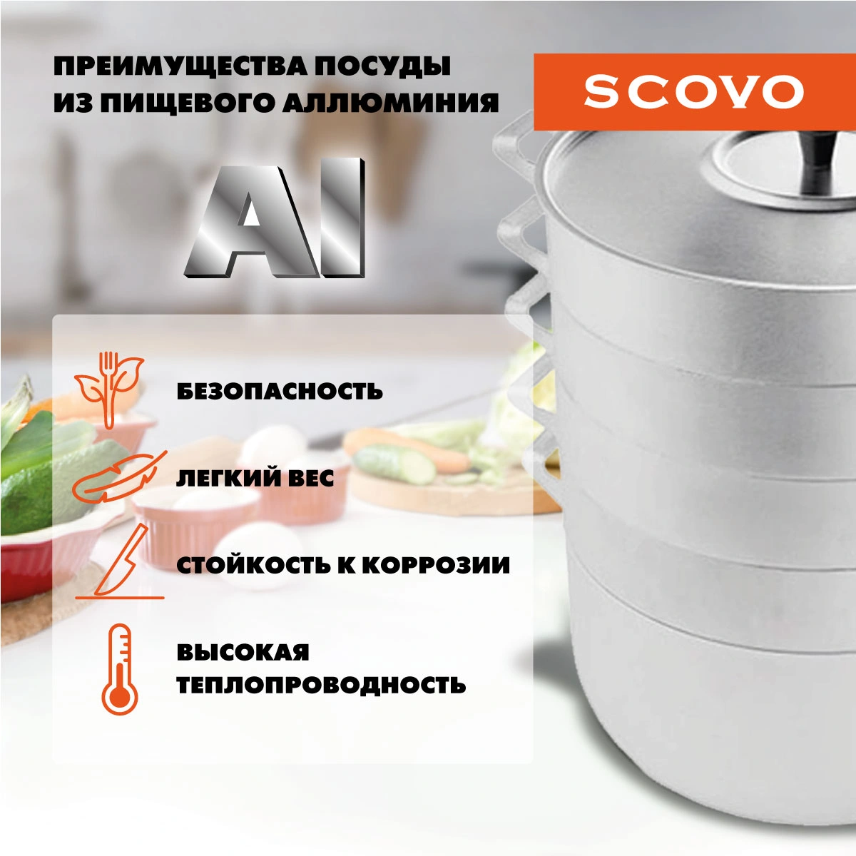 Алюминиевая мантоварка с четырьмя сетками, продукция российского производителя SCOVO. Объем 13 литров, диаметр 34 см. Артикул товара МТ-121. Купите в Москве мантоварку, SCOVO, МТ-121, 4 сетки, 13 л, самостоятельно или обратитесь за помощью к консультанту нашего магазина.
