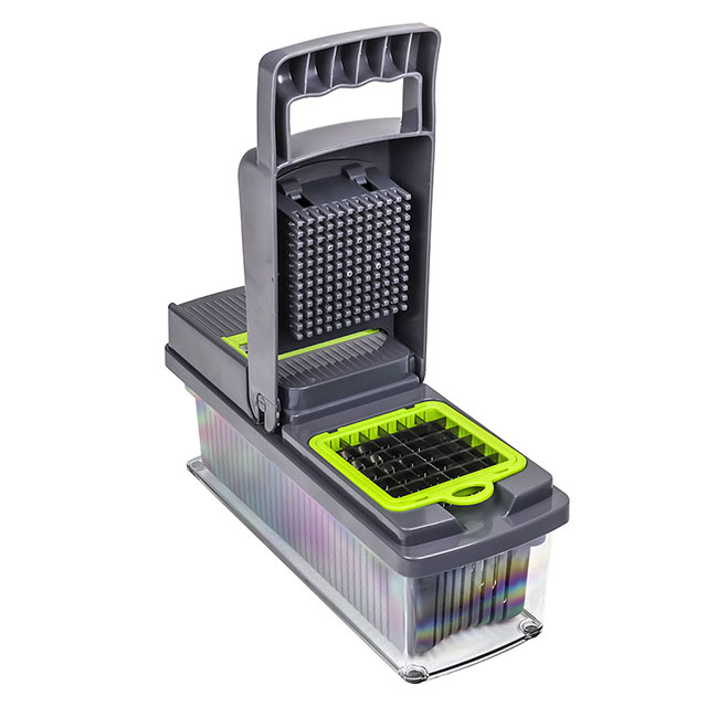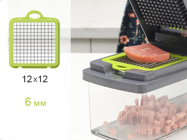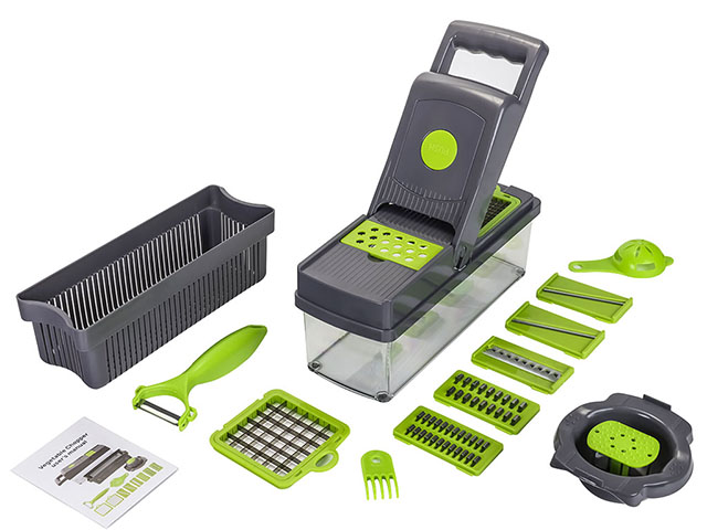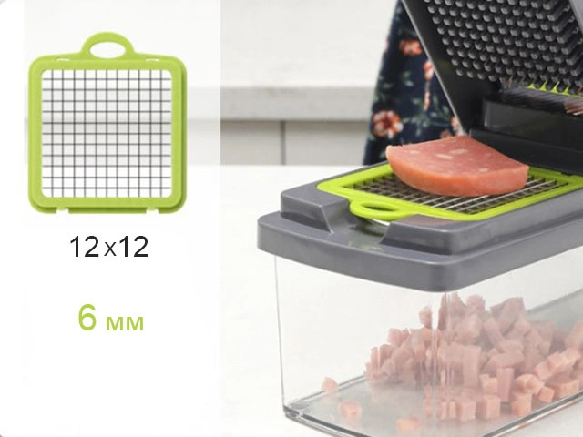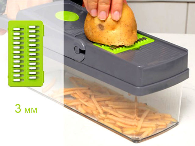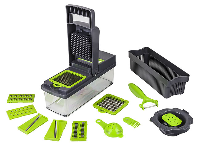 Ручная овощерезка поможет существенно сэкономить время, потраченное на приготовление обеда, праздничного стола или сезонных заготовок. Один компактный кухонный мультислайсер легко и быстро режет овощи, фрукты, сыры на ровные кубики, ломтики или слайсы. В комплекте 8 насадок: крупная и мелкая шинковка, терки двух видов для идеальной соломки, терка для рассыпчатой цедры, лезвия для нарезки ровных и гофрированных слайсов. Дополнительно в набор включены овощечистка, разделитель для яиц, сетка для мытья и сушки овощей и фруктов, вместительный контейнер из пищевого пластика. Эргономичная ручка и ножки с антискользящим покрытием делают использование измельчителя абсолютно безопасным. Все компоненты удобно и понятно собираются.