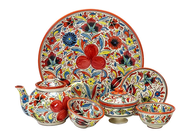 Риштанскую посуду отличают яркие цвета и богатые орнаменты. Каждое изделие уникально и неповторимо, в росписи нет ни одного повторяющегося рисунка. Узор всегда очень мелкий и тонкий, орнамент состоит из огромного числа элементов. Кстати, если посуда “риштан” выглядит идеально, без единого изъяна – знайте, это подделка!