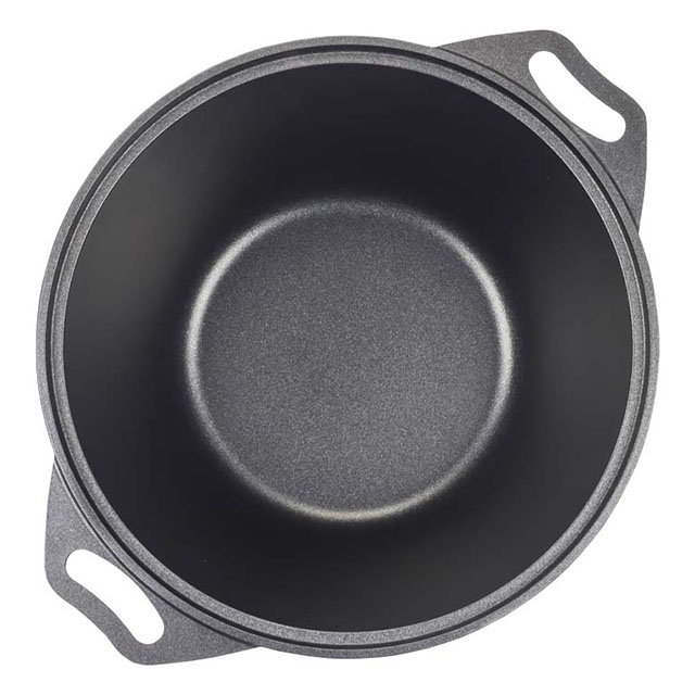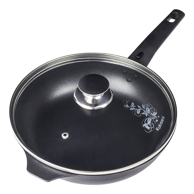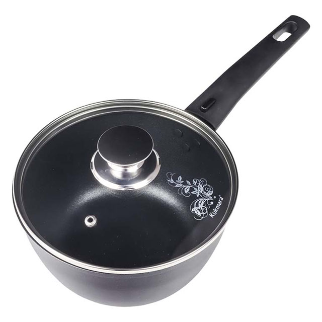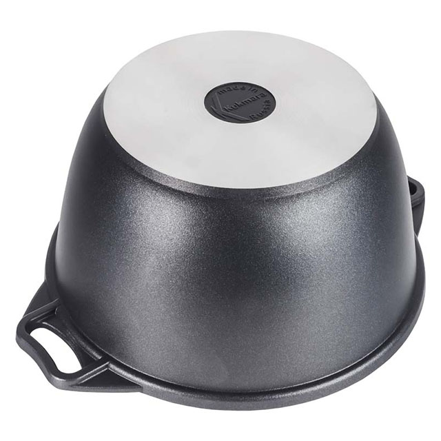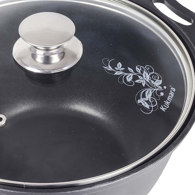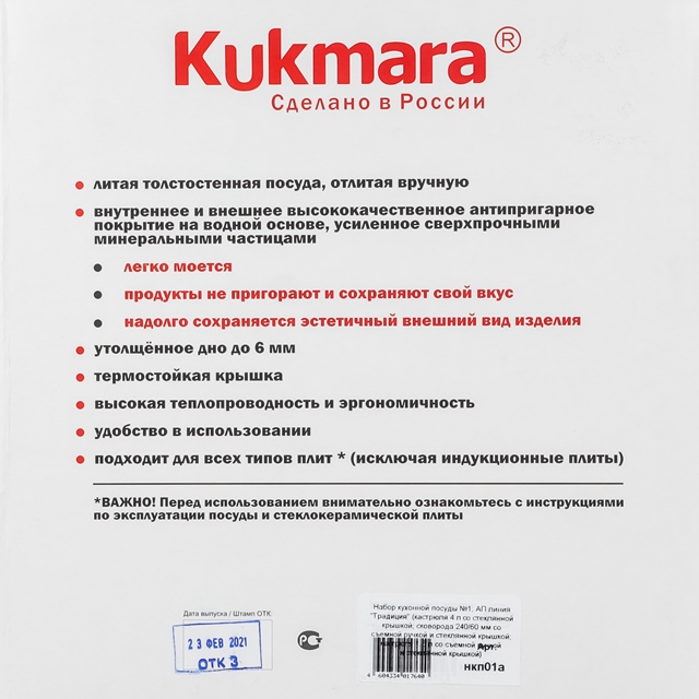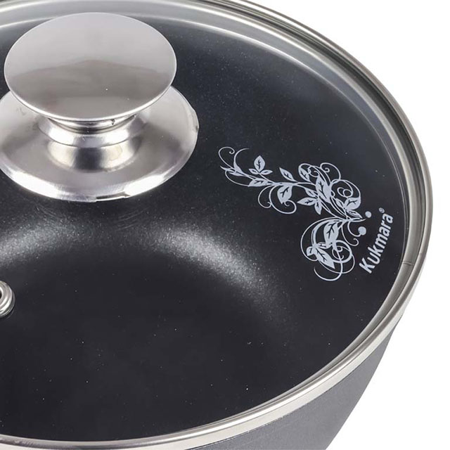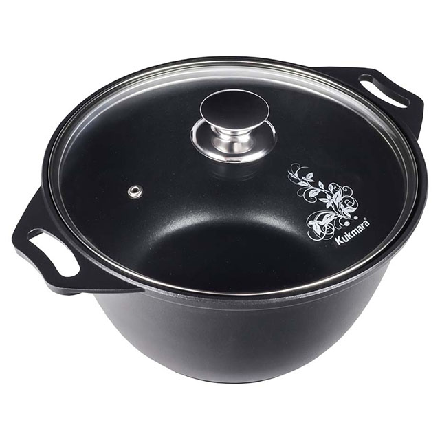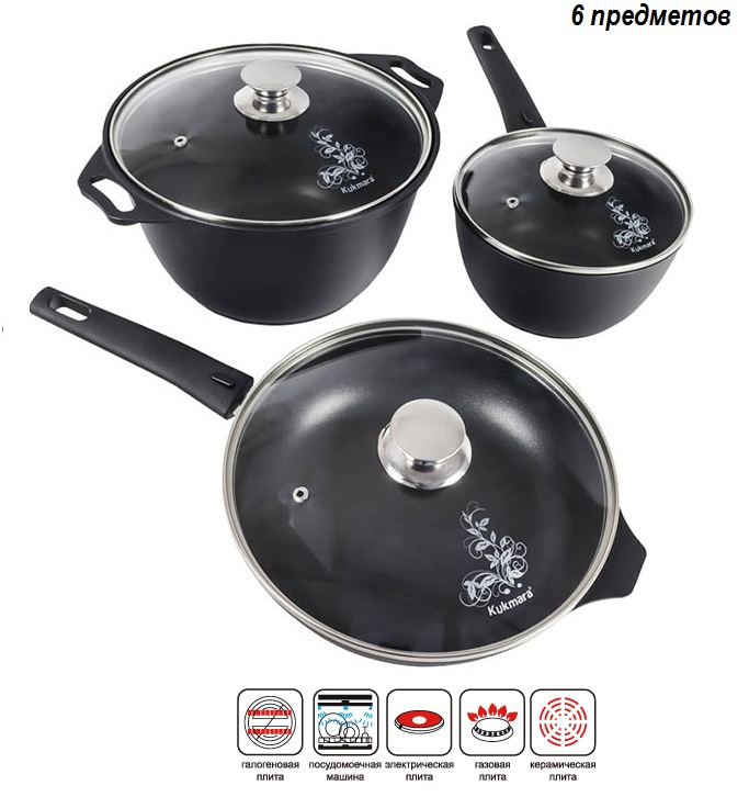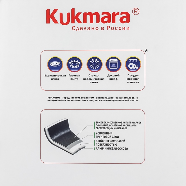 Посуда сделана из литого пищевого алюминия и покрыта уникальным по прочности антипригарным напылением с минеральными частицами. Прочные корпуса кастрюль и сковородок Kukmara не деформируются из-за механических повреждений и перепадов температур. Монолитные металлические ручки позволяют использовать большую кастрюлю в духовом шкафу. Посуда рассчитана на интенсивную ежедневную эксплуатацию, экологична и безвредна для здоровья. Полную информацию об уходе за посудой и рекомендации по ее использованию вы найдете на упаковке.