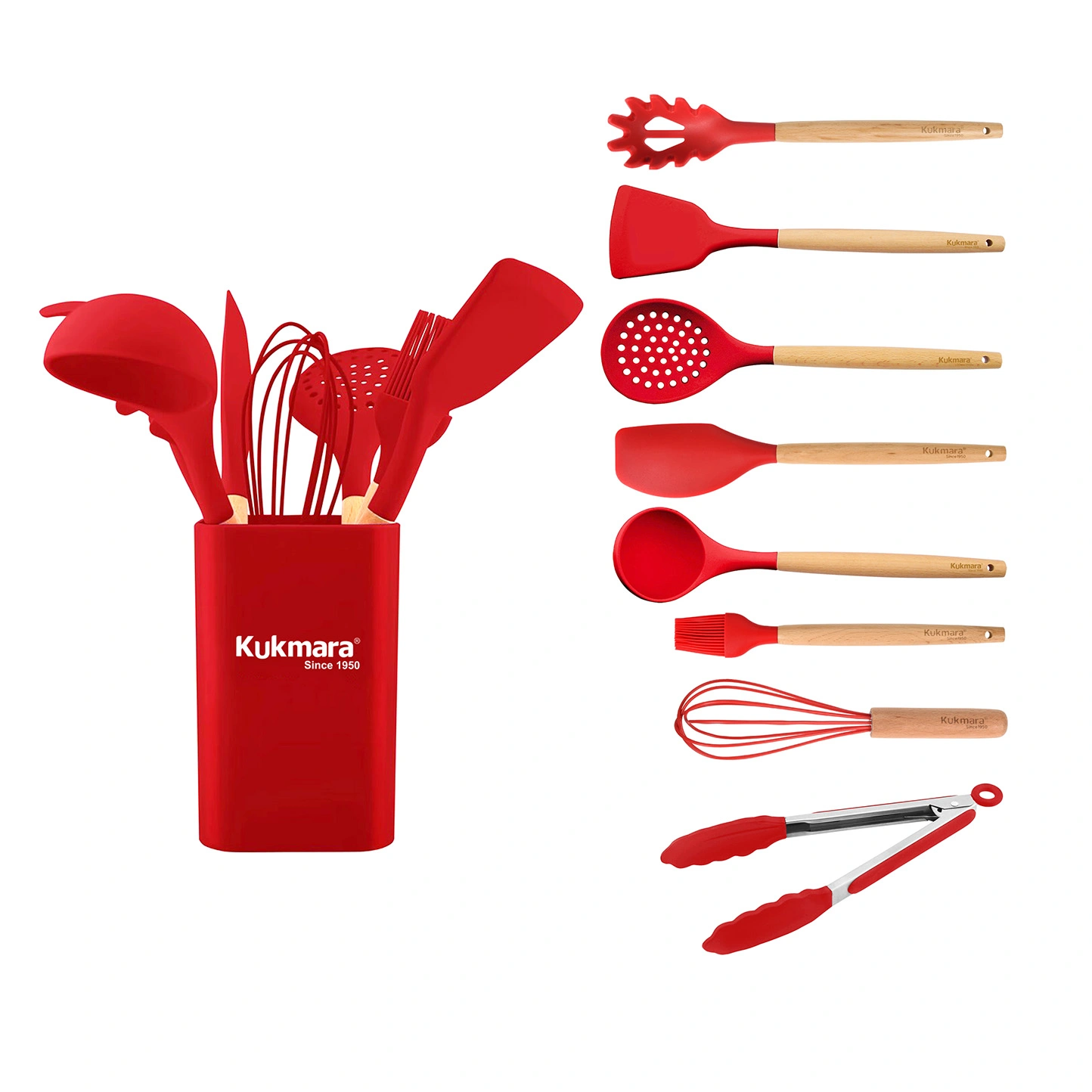 Кухонные принадлежности изготовлены из высококачественных материалов: силикона и натурального дерева, что делает их безопасными для здоровья и практичными для использования. Силикон выдерживает температуру до 230 градусов, не впитывает запахи. Отлично подойдет для посуды с антипригарным покрытием, не оставляет царапины на поверхности. Рукоятка предметов выполнена из натурального дерева, на которую нанесен логотип «KUKMARA». Имеет отверстие для тех, кто предпочитает размещать приборы в подвешенном состоянии.