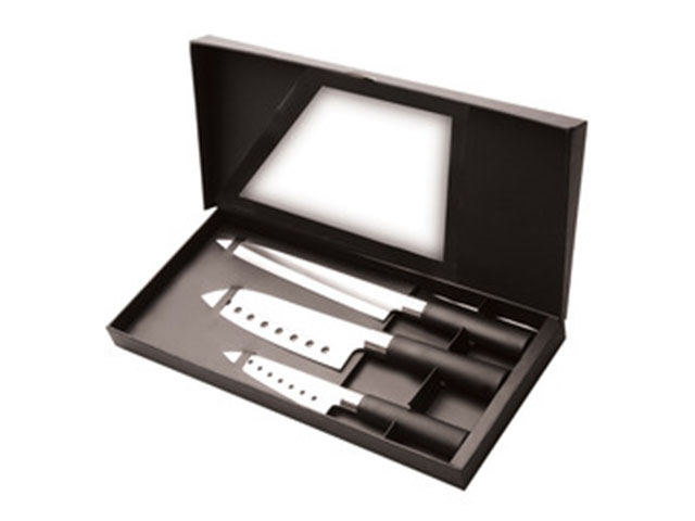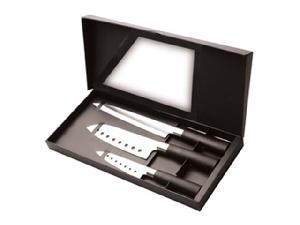 С помощью ножа для мяса легко нарезать мясо тонкими ломтиками. Часто используется в комбинации с вилкой для мяса, с помощью которой можно удерживать кусок во время нарезания. Нож Сантоку - нож в азиатском стиле с прямым режущим краем. Это универсальный нож для различных задач. Широкое лезвие , удобно для таких повседненых операций, как раздавливание чеснока и сбор нарезанных ингредиентов на лезвие. Отверстия на лезвии уменьшают прилипание к нему нарезаемых кусочков.Упаковано в привлекательную подарочную коробку.