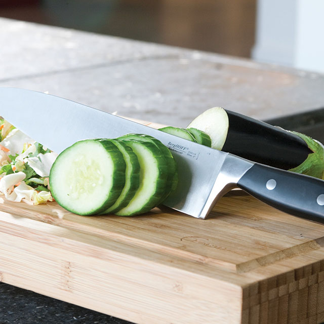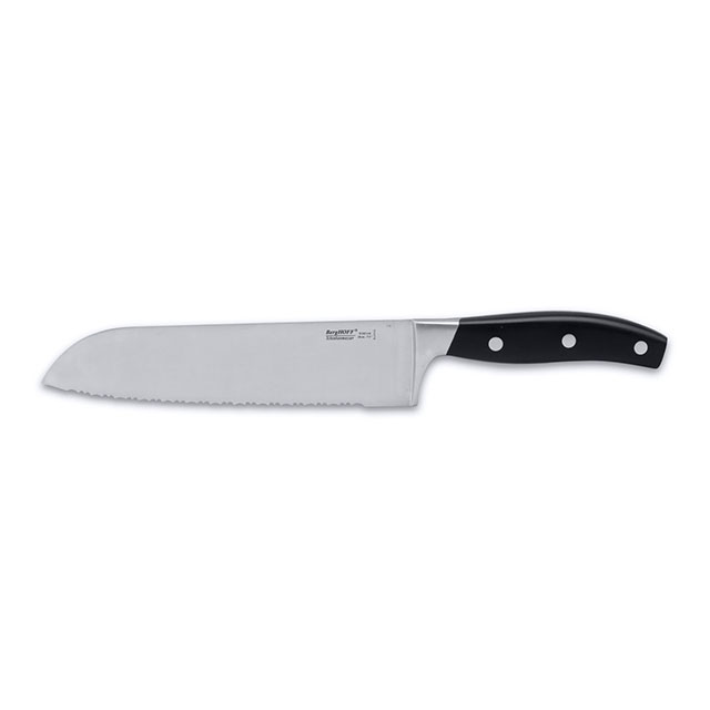 Универсальный набор ножей для всех кулинарных задач. Нож для очистки - маленький и легкий, с прямой режущей кромкой. Это по-настоящему универсальный нож, идеальный для очистки и других мелких работ. Часто используется для очистки фруктов и овощей, которые можно держать в руках. Если другие ножи используются на кухне для приготовления ингредиентов, ножи для стейка пригодятся уже за столом, когда стейк или другие мясные блюда уже готовы. Универсальный нож идеален для всех нарезочных работ, требующих точности. Нож Сантоку - нож в азиатском стиле с прямой кромкой лезвия. Это универсальный нож для различных кухонных работ. Широкое лезвие подходит и для некоторых специфических задач, таких как раздавливание чеснока и сбор нарезанных ингредиентов на лезвие. Нож для хлеба - большой нож с зубчатым лезвием. Используется для нарезания продуктов, твердых снаружи и мягких внутри, таких как хлеб и другая выпечка. Также может использоваться для нарезания томатов. Поварской нож - самый используемый на кухне. Загнутое кверху лезвие позволяет раскачивать нож во время нарезки на разделочной доске. Благодаря широкому и тяжелому лезвию также подходит для легких разрубочных работ. Острый нож безопасней, поскольку не нужно применять силу для нарезки. Мусат - это необходимый инструмент, чтобы сохранять ваши ножи острыми. Ножницы для разделки птицы специально разработаны, чтобы прорезать кости, куриную кожу и другие жесткие материалы. Они могут быть использованы как обычные кухонные ножницы, подходящие для целого круга более трудных кухонных нарезочных работ. С дополнительными досками для нарезки, вставляющимися в блок. Колода удобно сохраняет все ножи безопасным образом. Нескользящая платформа обеспечивает дополнительную устойчивость.