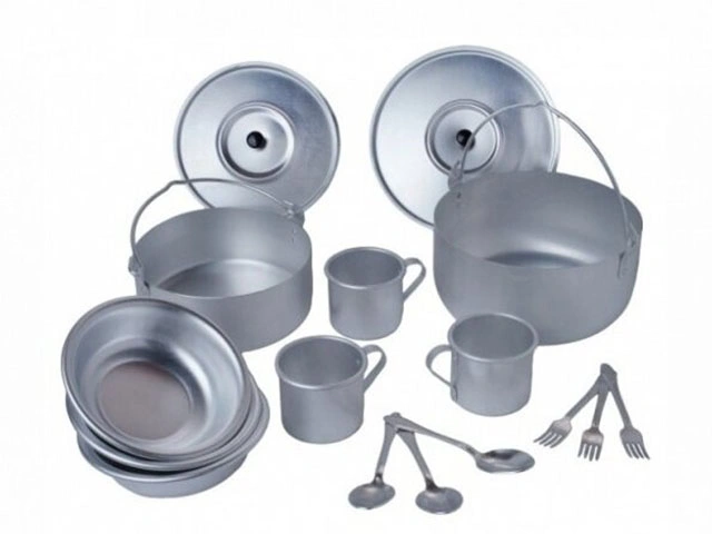 Набор походной посуды включает два котелка диаметром 22 и 26 см, три миски диаметром 20 см, три кружки объемом 0,5 л, три ложки и три вилки. Вся посуда изготовлена из матового пищевого алюминия в соответствии с ГОСТом. Производство российской марки SCOVO, артикул товара МТ-096. Купите в Москве набор посуды походный, SCOVO, МТ-096, 14 предметов, для дачи, похода, рыбалки в магазине Plover.
