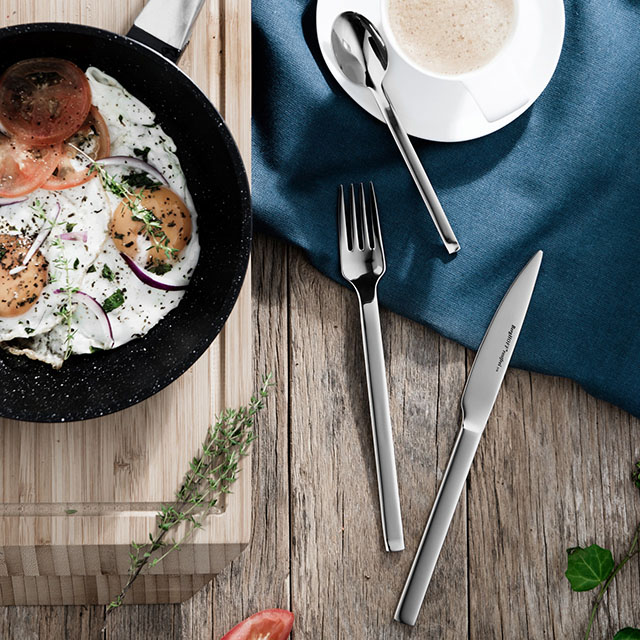 Этот набор включает в себя 6 наборов из 5 предметов: столовой вилки, столового ножа, столовой ложки, а также вилки для пирожных и кофейной ложки.