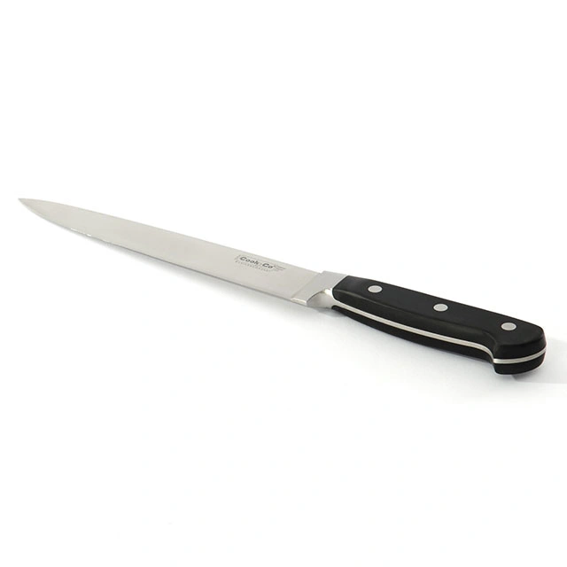 Нож для мяса сравнительно узкий и длинный. Чтобы аккуратно проходить вдоль волокон при разделке мяса, ножу необходим острый кончик. Длинное прямое лезвие позволяет нарезать мясо тонкими ломтиками. Крепкая ручка из термопластика выдерживает большие нагрузки. Между рукояткой и лезвием имеется упор для указательного пальца, эта металлическая площадка существует для того, чтобы во время работы с ножом рука не соскользнула к лезвию.