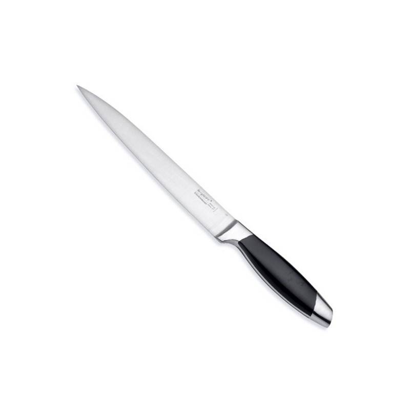 Изготовлен из высококачественой нержавеющей стали. Имеет ручную заточку. Тяжёлая кованая шейка обеспечивает идеальную балансировку и безопасность при использовании ножа. Ручка из прочного пластика обеспечивает надежный и удобный хват.