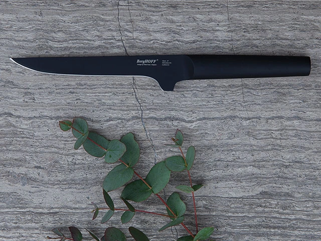 Отмеченная наградами коллекция Ron предлагает на выбор 4 впечатляющих стиля для воплощения множества кулинарных приемов. В дополнение к своей универсальности по принципу "смешивай и сочетай", линия Ron выполнена в стилистическом единстве: штатный дизайнер BergHOFF Питер Рукс с любовью создавал каждый предмет, используя как сочетающиеся, так и контрастирующие цвета и материалы.Серия Ron предлагает линию универсальных ножей для множества кухонных работ. Замечательно сбалансированные, с увесистой рукояткой, эти ножи обеспечивают идеальный баланс для дополнительного контроля. Вы можете выбрать эти черные стальные ножи с предотвращающим налипание титановым покрытием в версии с контрастными ясеневыми ручками или с сочетающимися по цвету черными.Нож для выемки костей имеет тонкое гибкое лезвие, которое позволяет ему работать в узких местах.Лезвие с керамическим покрытием обеспечивает мягкое нарезание без прилипания нарезаемой еды на лезвие.