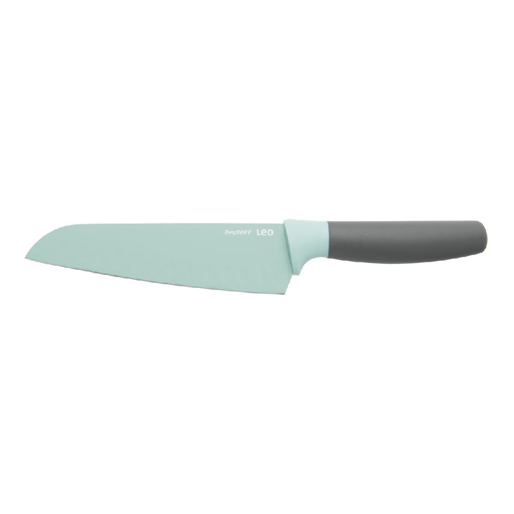 "Известный своей универсальностью, нож Сантоку Leo легко справится с выполнением самых разнообразных задач. Особенно хорошо ему даётся нарезка овощей - благодаря широкому и легкому лезвию, этот нож позволит быстро измельчить или порезать на ломтики. Лезвие имеет специальное покрытие против налипания, свойства которого усиливаются маленькими гребнями. Резать продукты проще простого с помощью этого универсального ножа в азиатском стиле!