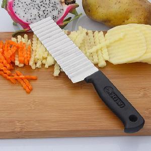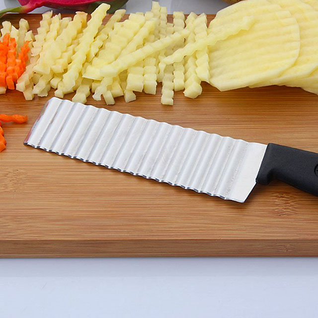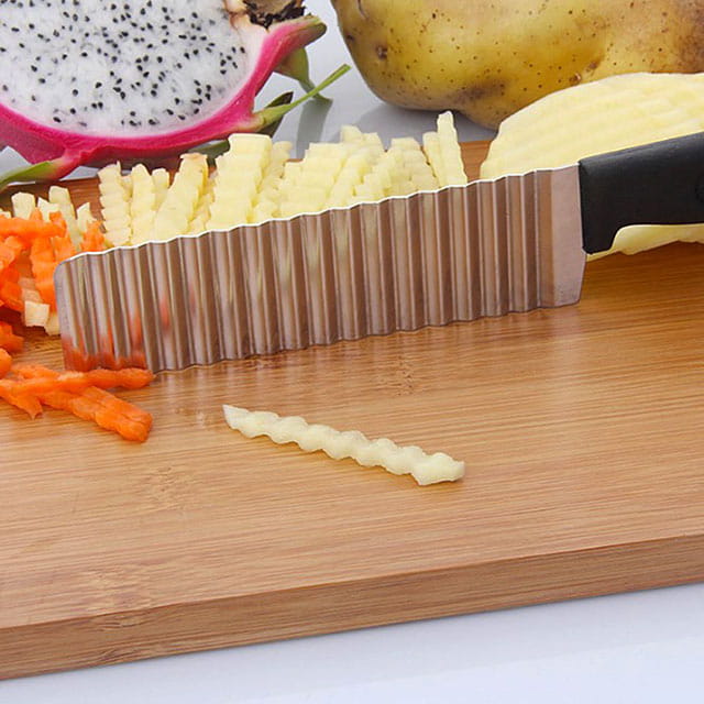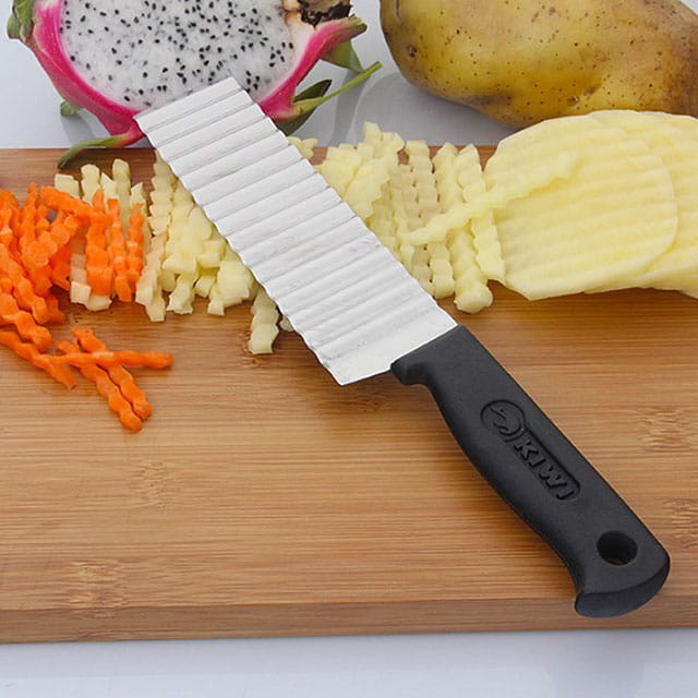 Рифленый нож для красивой нарезки поможет подготовить праздничный стол и внести разнообразие в оформление повседневных блюд, а также заготовить не только вкусные, но и оригинально выглядящие консервы. Волнистый нож из нержавеющей стали нарежет ингредиенты тонкими или толстыми рифлёными пластинками или брусочками. Чаще всего его используют для нарезки картофеля фри или домашних чипсов, но он подойдет и для других продуктов.